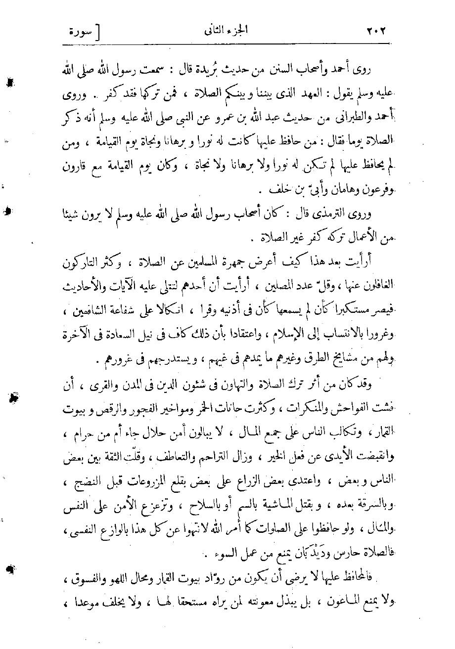 أرأيت بعد هذا كيف أعرض جمهرة المسلمين عن الصلاة، وكثر التاركون الغافلون عنها، وقلّ عدد المصلين، أرأيت أن أحدهم لتتلى عليه الآيات والأحاديث فيصرّ مستكبرا كأن لم يسمعها كأنّ في أذنيه وقرا، اتكالا على شفاعة الشافعين، وغرورا بالانتساب إلى الإسلام، واعتقادا بأن ذلك كاف في نيل السعادة في الآخرة، ولهم من مشايخ الطرق وغيرهم ما يمدّهم في غيهم، ويستدرجهم في غرورهم.