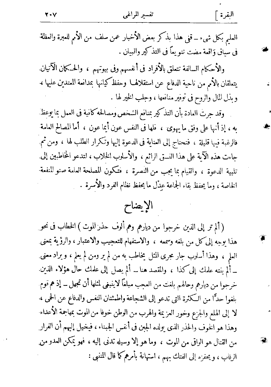 (أَلَمْ تَرَ إِلَى الَّذِينَ خَرَجُوا مِنْ دِيارِهِمْ وَهُمْ أُلُوفٌ حَذَرَ الْمَوْتِ) الخطاب في نحو هذا يوجه إلى كل من بلغه وسمعه، والاستفهام للتعجيب والاعتبار، والرؤية بمعنى العلم، وهذا أسلوب جار مجرى المثل يخاطب به من لم يرو من لم يعلم، ويراد معنى- ألم ينته علمك إلى كذا، والمقصد هنا- ألم يصل إلى علمك حال هؤلاء الذين خرجوا من ديارهم وحالهم بلغت من العجب مبلغا لا ينبغى لمثلها أن تجهل- إذ هم قوم بلغوا حدّا من الكثرة التي تدعو إلى الشجاعة واطمئنان النفس والدفاع عن الحمى، لا إلى الهلع والجزع وخور العزيمة والهرب من الوطن خوفا من الموت بمهاجمة الأعداء، وهذا هو الخوف والحذر الذي يولده الجبن في أنفس الجبناء، فيخيل إليهم أن الفرار من القتال هو الواقي من الموت، وما هو إلا وسيلة تدني إليه، فهو يمكّن العدوّ من الرقاب، ويحفزه إلى الفتك بهم، استهانة بأمرهم كما قال المتنبي: