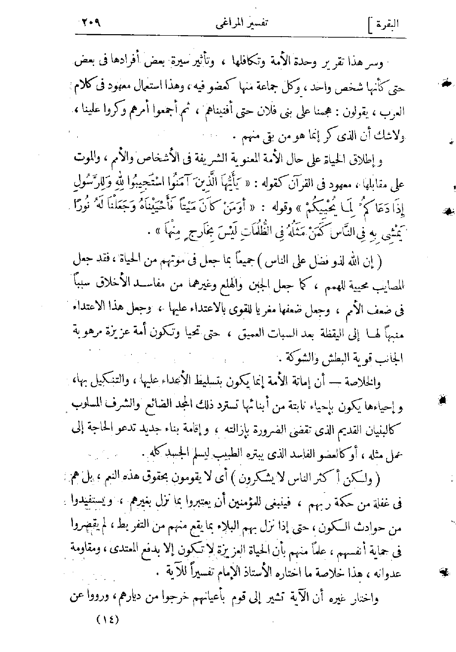 وإطلاق الحياة على حال الأمة المعنوية الشريفة في الأشخاص والأمم، والموت على مقابلها، معهود في القرآن كقوله: «يا أَيُّهَا الَّذِينَ آمَنُوا اسْتَجِيبُوا لِلَّهِ وَلِلرَّسُولِ إِذا دَعاكُمْ لِما يُحْيِيكُمْ» وقوله: «أَوَمَنْ كانَ مَيْتاً فَأَحْيَيْناهُ وَجَعَلْنا لَهُ نُوراً يَمْشِي بِهِ فِي النَّاسِ كَمَنْ مَثَلُهُ فِي الظُّلُماتِ لَيْسَ بِخارِجٍ مِنْها» .