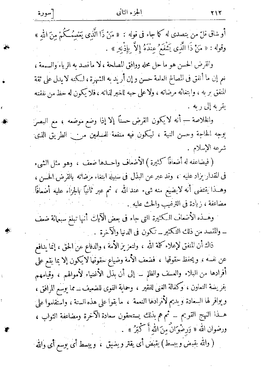 ذاك أن المنفق لإعلاء كلمة الله، ولتعزيز الأمة، والدفاع عن الحق، إنما يدافع عن نفسه، ويحفظ حقوقها، فضعف الأمة وضياع حقوقها لا يكون إلا بما يقع على أفرادها من البلاء والعسف والظلم- إلى أن بذل الأغنياء لأموالهم، وقيامهم بفريضة التعاون، وكفالة الغنى للفقير، وحماية القوىّ للضعيف- مما يوسع المرافق على الأمة ويوفر لها السعادة ويديم لأفرادها النعمة، ما بقوا على هذه السنة، واستقاموا على هذا النهج القويم ثم هم بذلك يستحقون سعادة الآخرة ومضاعفة الثواب، ورضوان الله «ورضوان من الله أكبر» .