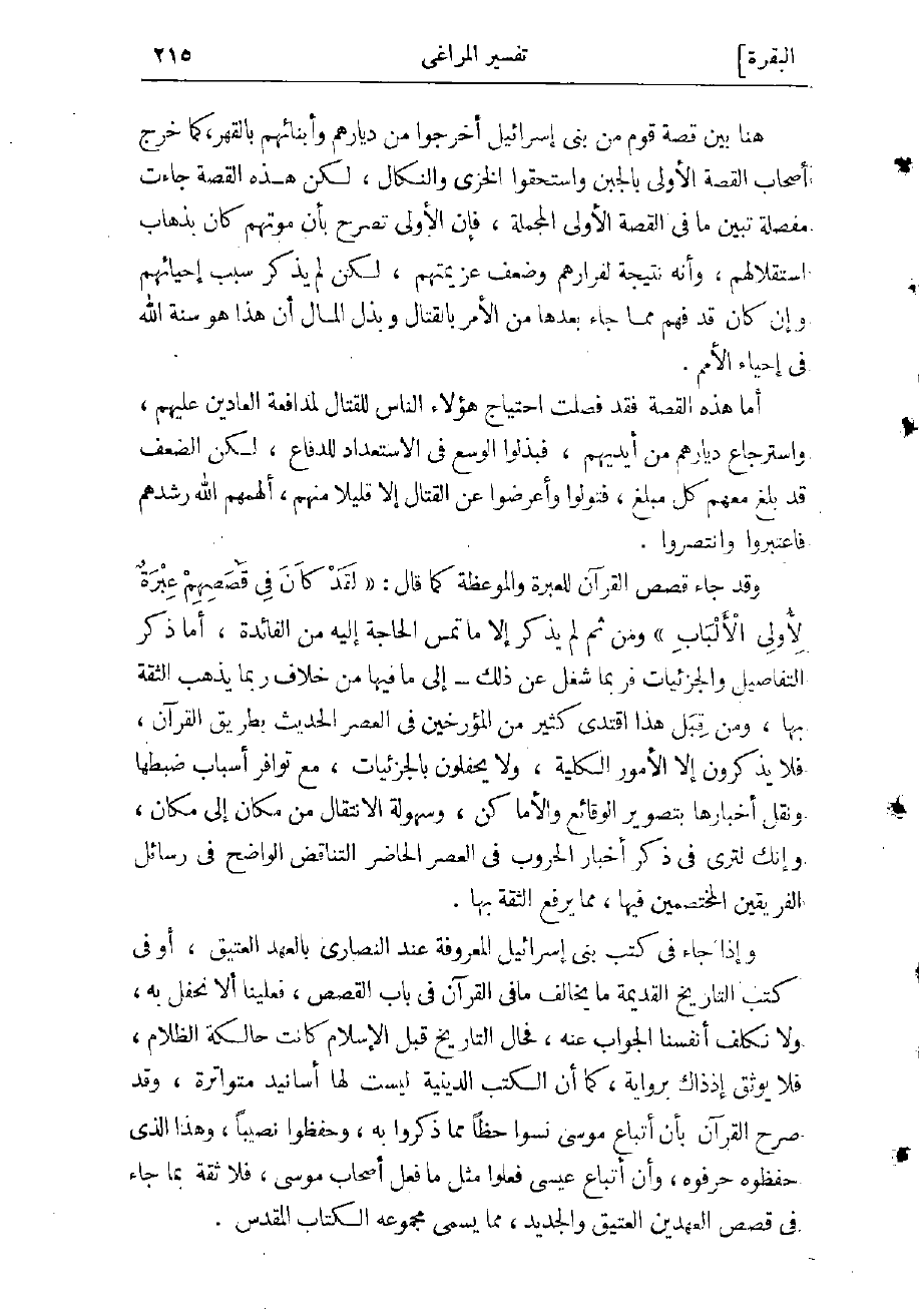 وإذا جاء في كتب بنى إسرائيل المعروفة عند النصارى بالعهد العتيق، أو في كتب التاريخ القديمة ما يخالف ما في القرآن في باب القصص، فعلينا ألا نحفل به ولا نكلف أنفسنا الجواب عنه، فحال التاريخ قبل الإسلام كانت حالكة الظلام، فلا يوثق إذ ذاك برواية، كما أن الكتب الدينية ليست لها أسانيد متواترة، وقد صرح القرآن بأن أتباع موسى نسوا حظّا مما ذكروا به، وحفظوا نصيبا وهذا الذي حفظوه حرفوه، وأن أتباع عيسى فعلوا مثل ما فعل أصحاب موسى، فلا ثقة بما جاء في قصص العهدين العتيق والجديد مما يسمى مجموعه الكتاب المقدس.