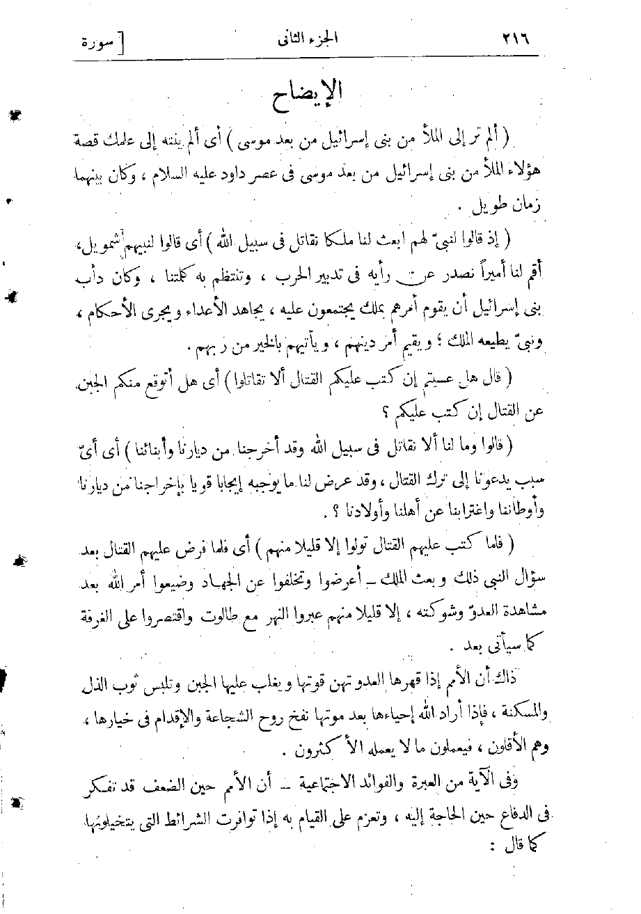 وفي الآية من العبرة والفوائد الاجتماعية- أن الأمم حين الضعف قد تفكر فى الدفاع حين الحاجة إليه، وتعزم على القيام به إذا توافرت الشرائط التي يتخيلونها كما قال: