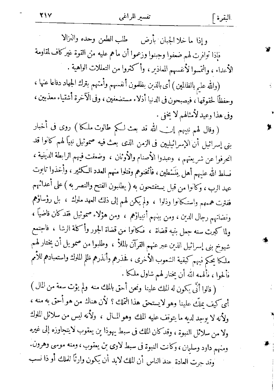 (قالَ لَهُمْ نَبِيُّهُمْ إِنَّ اللَّهَ قَدْ بَعَثَ لَكُمْ طالُوتَ مَلِكاً) روى في أخبار بنى إسرائيل أن الإسرائيليين في الزمن الذي بعث فيه صموئيل نبيا لهم، كانوا قد انحرفوا عن شريعتهم، وعبدوا الأصنام والأوثان، وضعفت فيهم الرابطة الدينية، فسلط الله عليهم أهل فلسطين، فأثخنوهم وقتلوا منهم العدد الكثير، وأخذوا تابوت عهد الرب، وكانوا من قبل يستفتحون به (يطلبون الفتح والنصر به) على أعدائهم ففترت هممهم واستكانوا وذلوا، ولم يكن لهم إلى ذلك العهد ملوك، بل رؤساؤهم وقضاتهم رجال الدين، ومن بينهم أنبياؤهم، ومن هؤلاء صموئيل فقد كان قاضيا، ولما كبرت سنه جعل بنيه قضاة، فكانوا من قضاة الجور وأكلة الرّشا، فاجتمع شيوخ بنى إسرائيل الذين عبر عنهم القرآن بالملأ، وطلبوا من صمويل أن يختار لهم ملكا يحكم فيهم كبقية الشعوب الأخرى، فحذرهم وأنذرهم ظلم الملوك واستعبادهم للأمم فألحوا، فألهمه الله أن يختار لهم شاول ملكا.