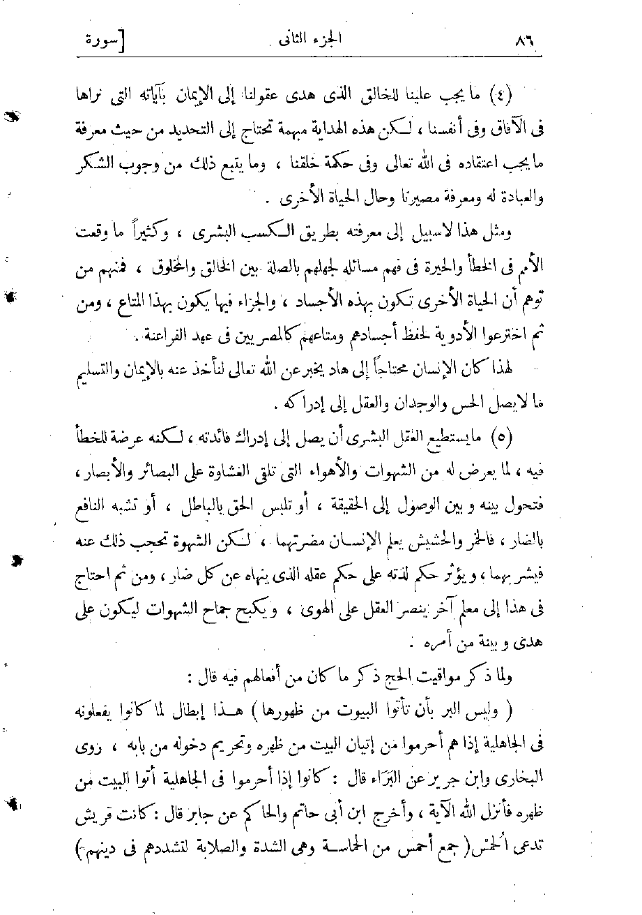 (4) ما يجب علينا للخالق الذي هدى عقولنا إلى الإيمان بآياته التي نراها في الآفاق وفي أنفسنا، لكن هذه الهداية مبهمة تحتاج إلى التحديد من حيث معرفة ما يجب اعتقاده في الله تعالى وفي حكمة خلقنا، وما يتبع ذلك من وجوب الشكر والعبادة له، ومعرفة مصيرنا وحال الحياة الأخرى.