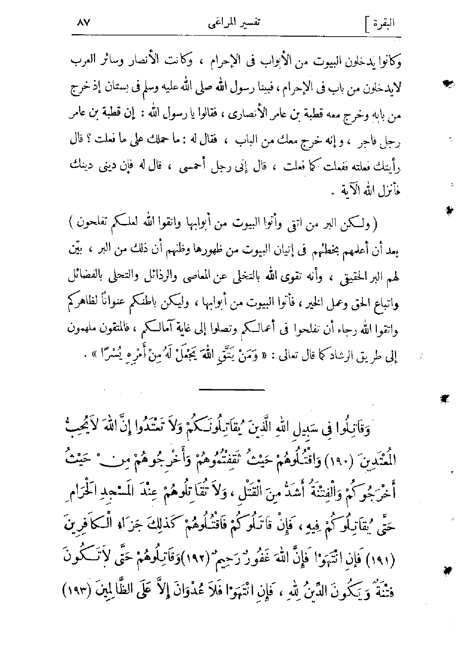 (وَلكِنَّ الْبِرَّ مَنِ اتَّقى، وَأْتُوا الْبُيُوتَ مِنْ أَبْوابِها وَاتَّقُوا اللَّهَ لَعَلَّكُمْ تُفْلِحُونَ) بعد أن أعلمهم بخطئهم في إتيان البيوت من ظهورها وظنهم أن ذلك من البرّ، بيّن لهم البرّ لحقيقى، وأنه تقوى الله بالتخلي عن المعاصي والرذائل، والتحلي بالفضائل واتباع الحقّ وعمل الخير، فأتوا البيوت من أبوابها، وليكن باطنكم عنوانا لظاهركم، واتقوا الله رجاء أن تفلحوا في أعمالكم وتصلوا إلى غاية آمالكم، فالمتقون ملهمون إلى طريق الرشاد، كما قال تعالى: «وَمَنْ يَتَّقِ اللَّهَ يَجْعَلْ لَهُ مِنْ أَمْرِهِ يُسْراً» .
