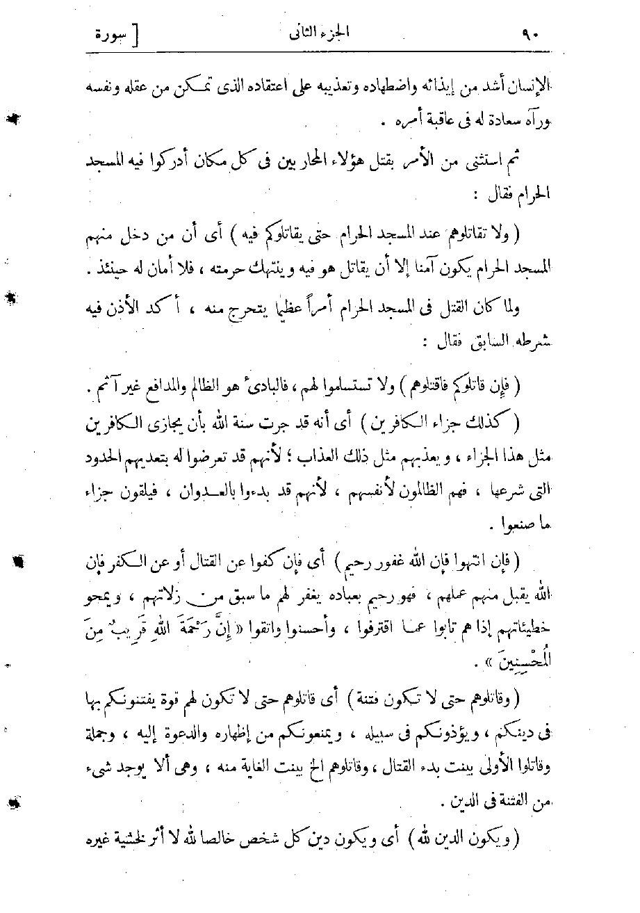 (وَلا تُقاتِلُوهُمْ عِنْدَ الْمَسْجِدِ الْحَرامِ حَتَّى يُقاتِلُوكُمْ فِيهِ) أي إن من دخل منهم المسجد الحرام يكون آمنا إلا أن يقاتل هو فيه وينتهك حرمته، فلا أمان له حينئذ.