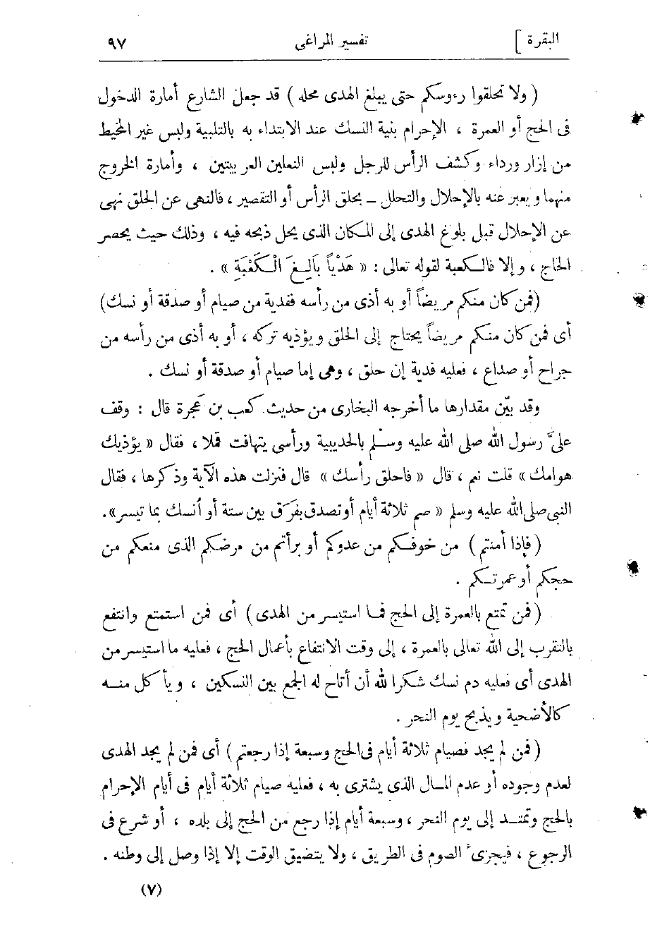 (وَلا تَحْلِقُوا رُؤُسَكُمْ حَتَّى يَبْلُغَ الْهَدْيُ مَحِلَّهُ) قد جعل الشارع أمارة الدخول في الحج أو العمرة، الإحرام بنية النسك عند الابتداء به بالتلبية ولبس غير المخيط من إزار ورداء وكشف الرأس للرجل ولبس النعلين العربيتين، وأمارة الخروج منهما (ويعبر عنه بالإحلال والتحلل) بحلق الرأس أو التقصير، فالنهي عن الحلق نهى عن الإحلال قبل بلوغ الهدى إلى المكان الذي يحل ذبحه فيه، وذلك حيث يحصر الحاج، وإلا فالكعبة لقوله تعالى «هَدْياً بالِغَ الْكَعْبَةِ» .