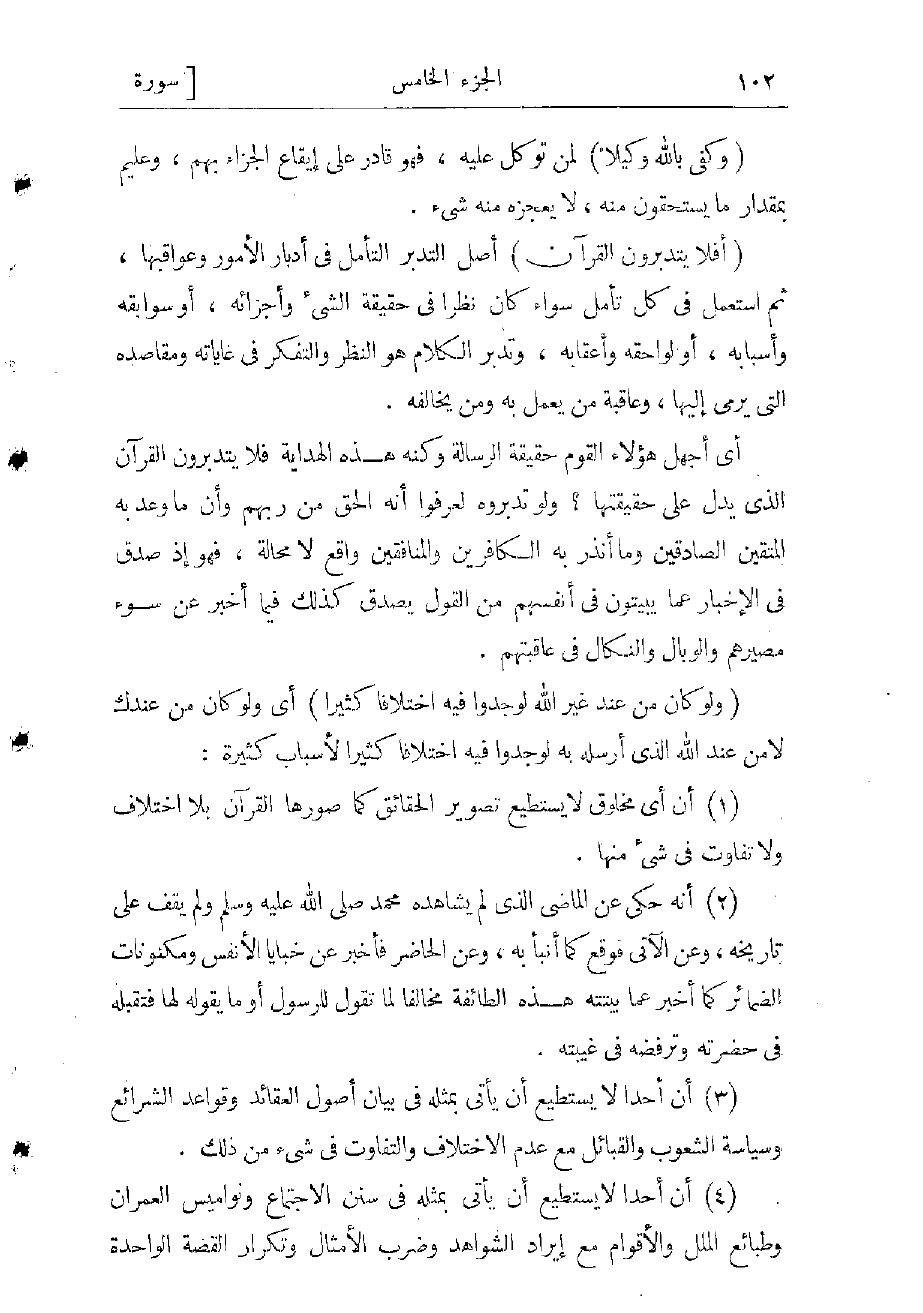 4) أن أحدا لا يستطيع أن يأتى بمثله فى سنن الاجتماع ونواميس العمران وطبائع الملل والأقوام مع إيراد الشواهد وضرب الأمثال وتكرار القصة الواحدة بالعبارات