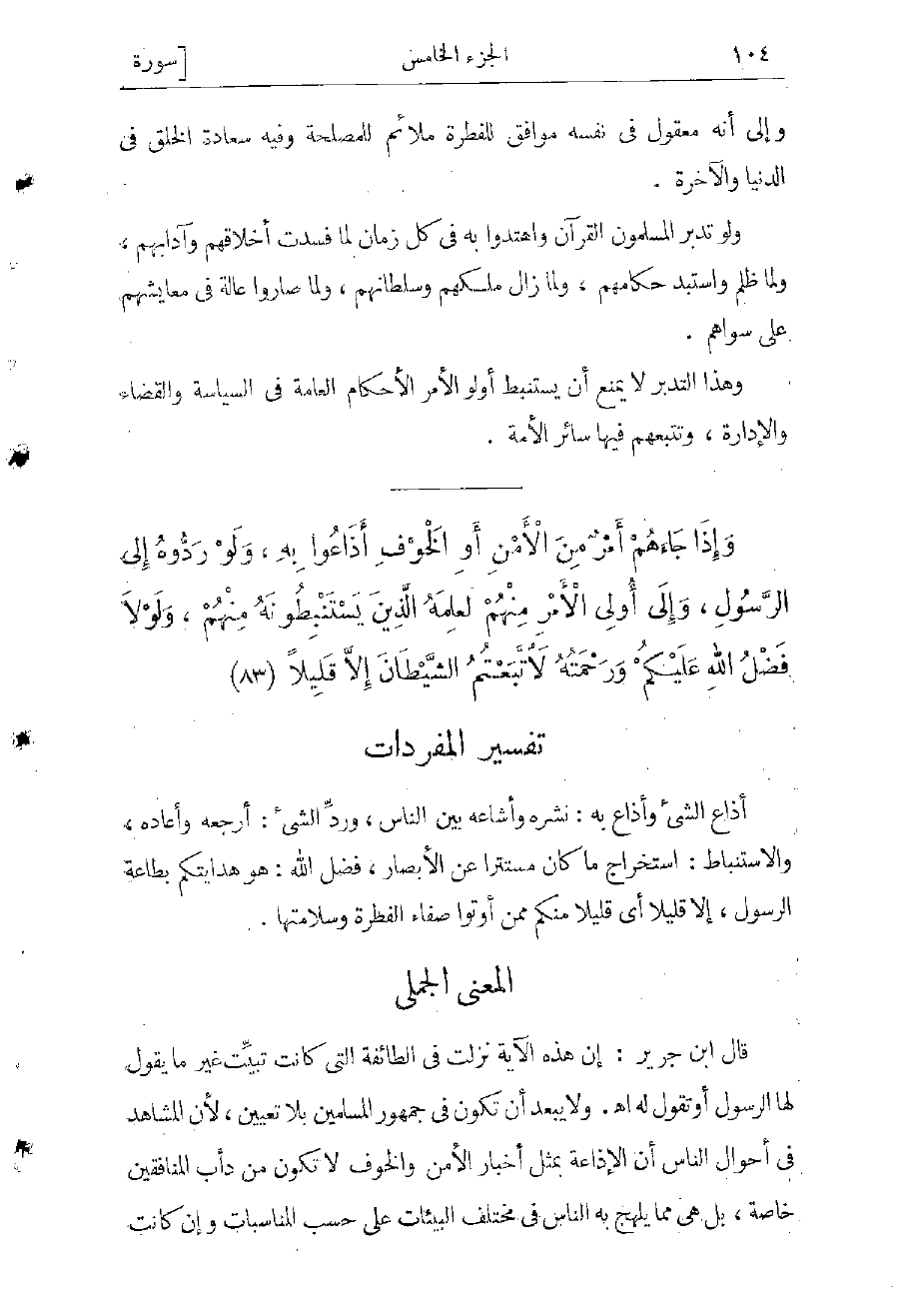 وهذا التدبر لا يمنع أن يستنبط أولو الأمر الأحكام العامة فى السياسة والقضاء والإدارة، وتتبعهم فيها سائر الأمة.
