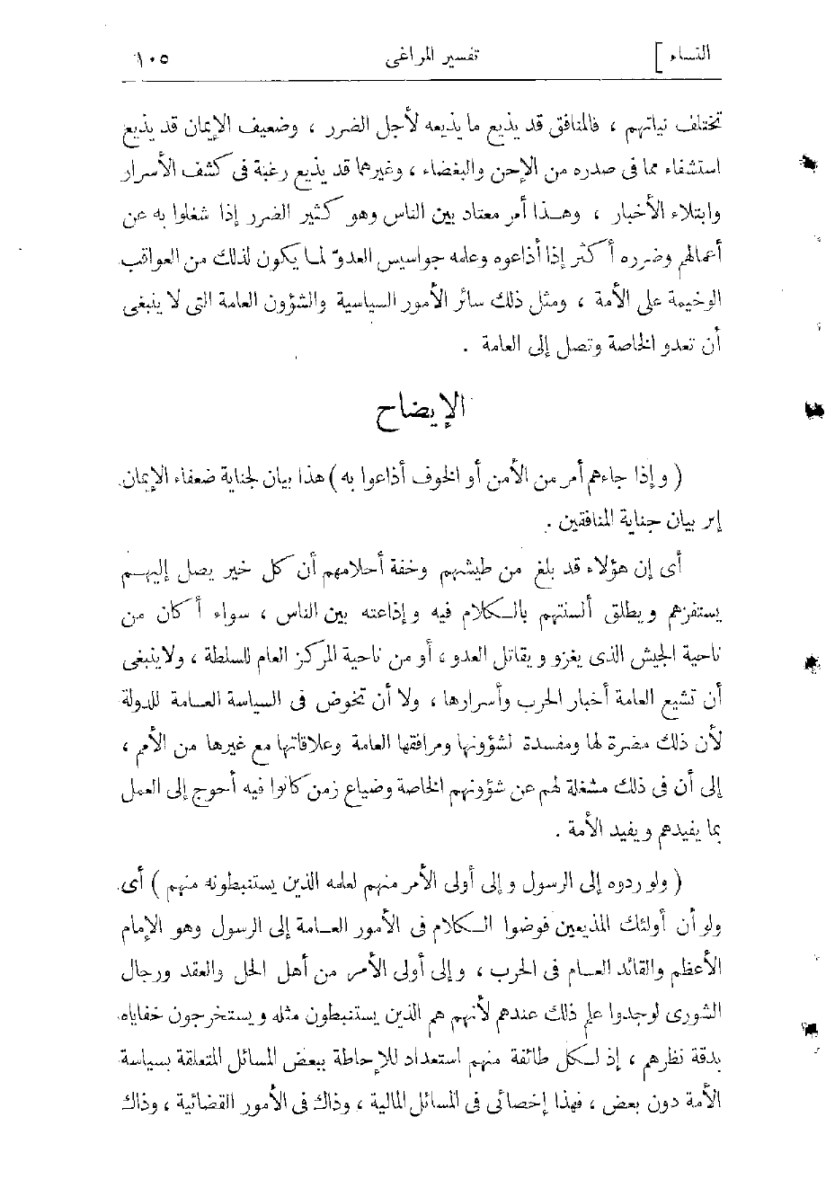 (وَإِذا جاءَهُمْ أَمْرٌ مِنَ الْأَمْنِ أَوِ الْخَوْفِ أَذاعُوا بِهِ) أي إن هؤلاء الضعفة من المسلمين الذين لا خبرة لهم بالشئون العامة قد بلغ من طيشهم وخفة أحلامهم أن كل خير يصل إليهم يستفزهم ويطلق ألسنتهم بالكلام فيه وإذاعته بين الناس، سواء أكان من ناحية الجيش الذي يغزو ويقاتل العدو، أو من ناحية المركز العام للسلطة، ولا ينبغى أن تشيع العامة أخبار الحرب وأسرارها، ولا أن تخوض فى السياسة العامة للدولة، لأن ذلك مضرّة لها ومفسدة لشؤونها ومرافقها العامة وعلاقاتها مع غيرها من الأمم إلى أن فى ذلك مشغلة لهم عن شؤونهم الخاصة وضياع زمن كانوا فيه أحوج إلى العمل بما يفيدهم ويفيد الأمة.