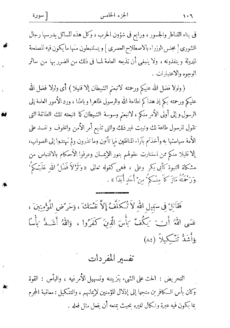 (وَلَوْلا فَضْلُ اللَّهِ عَلَيْكُمْ وَرَحْمَتُهُ لَاتَّبَعْتُمُ الشَّيْطانَ إِلَّا قَلِيلًا) أي ولولا فضل الله عليكم ورحمته بكم، إذ هداكم لطاعته وطاعة رسوله ظاهرا وباطنا، ورد الأمور العامة إلى الرسول وإلى أولى الأمر منكم، لاتبعتم وسوسة الشيطان كما اتبعته تلك الطائفة التي تقول للرسول: طاعة لك وتبيت غير ذلك، والتي تذيع أمر الأمن والخوف وتفسد على الأمة سياستها، ولأخذتم بآراء المنافقين فيما تأتون وما تذرون، ولم تهتدوا إلى الصواب، إلا قليلا منكم ممن استنارت عقولهم بنور الإيمان وعرفوا الأحكام بالاقتباس من مشكاة النبوة كأبى بكر وعمر وعثمان وعلى، فهى كقوله تعالى «وَلَوْلا فَضْلُ اللَّهِ عَلَيْكُمْ وَرَحْمَتُهُ ما زَكى مِنْكُمْ مِنْ أَحَدٍ أَبَداً» .