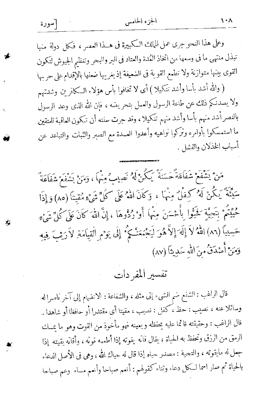 قال الراغب: الشفع ضم الشيء إلى مثله، والشفاعة: الانضمام إلى آخر ناصرا له وسائلا عنه، نصيب: حظ، كفل: نصيب، مقيتا: أي مقتدرا أو حافظا أو شاهدا.