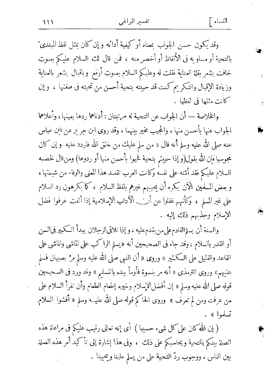 وقد روى ابن جرير عن ابن عباس عنه صلى الله عليه وسلم أنه قال «من سلم عليك من خلق الله فاردد عليه وإن كان مجوسيا فإن الله يقول (وَإِذا حُيِّيتُمْ بِتَحِيَّةٍ فَحَيُّوا بِأَحْسَنَ مِنْها أَوْ رُدُّوها)