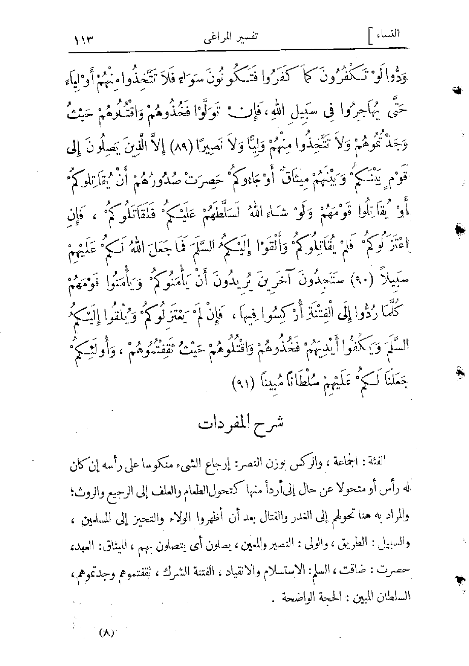 الفئة: الجماعة، والركس بوزن النصر: إرجاع الشيء منكوسا على رأسه إن كان له رأس، أو متحولا عن حال إلى أردأ منها كتحول الطعام والعلف إلى الرجيع والروث والمراد به هنا تحولهم إلى الغدر والقتال بعد أن أظهروا الولاء والتحيز إلى المسلمين، والسبيل: الطريق، والولي: النصير والمعين، يصلون: أي يتصلون بهم، الميثاق: