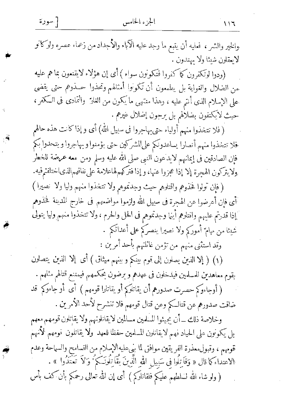 (فَإِنْ تَوَلَّوْا فَخُذُوهُمْ وَاقْتُلُوهُمْ حَيْثُ وَجَدْتُمُوهُمْ وَلا تَتَّخِذُوا مِنْهُمْ وَلِيًّا وَلا نَصِيراً) أي فإن أعرضوا عن الهجرة فى سبيل الله ولزموا مواضعهم فى خارج المدينة فخذوهم إذا قدرتم عليهم واقتلوهم أينما وجدتموهم فى الحلّ أو فى الحرم، ولا تتخذوا منهم وليا يتولى شيئا من مهامّ أموركم ولا نصيرا ينصركم على أعدائكم.