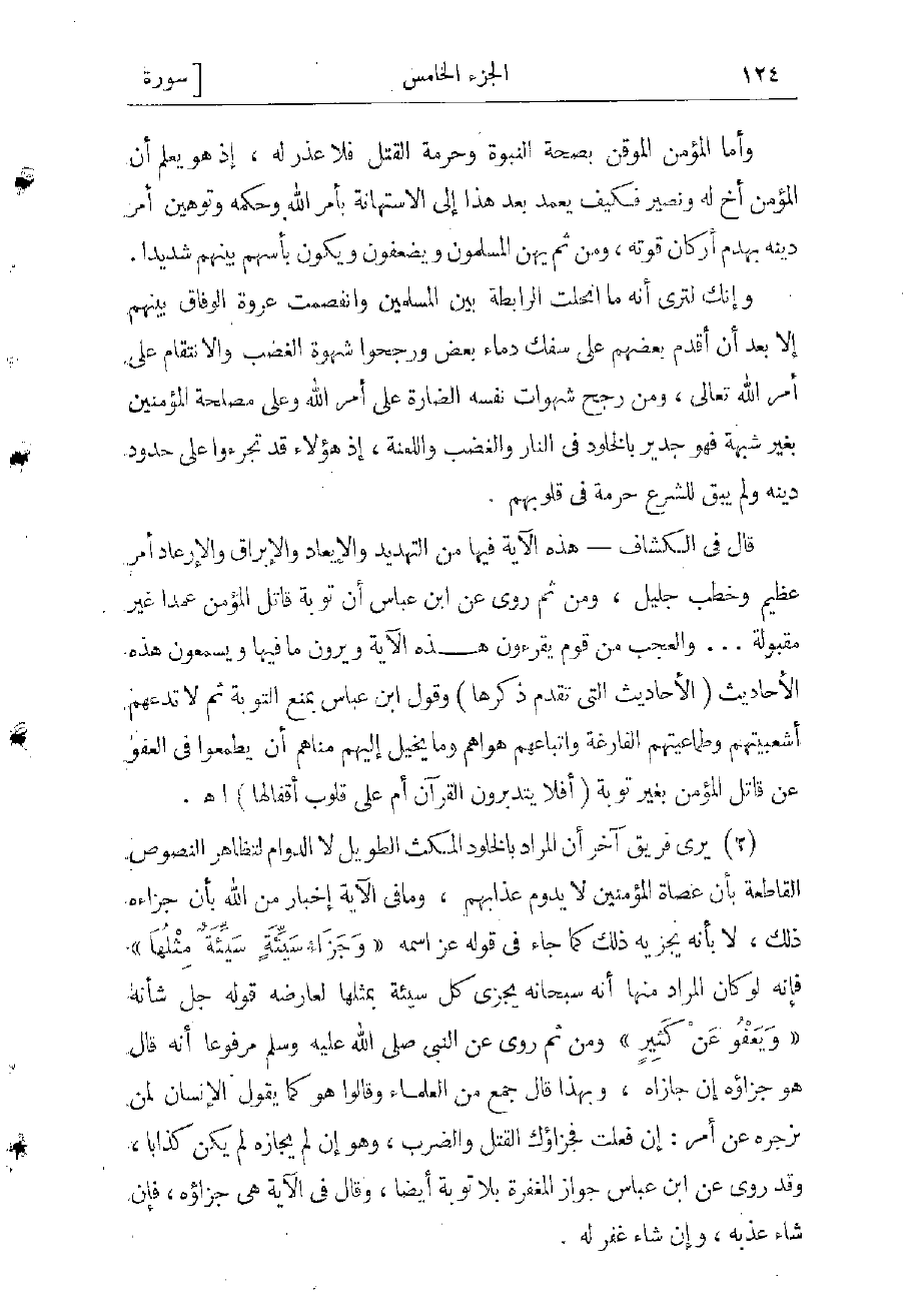 قال فى الكشاف: هذه الآية فيها من التهديد والإيعاد، والإبراق والإرعاد، أمر عظيم، وخطب جليل، ومن ثم روى عن ابن عباس أن توبة قاتل المؤمن عمدا غير مقبولة ... والعجب من قوم يقرءون هذه الآية ويرون ما فيها ويسمعون هذه الأحاديث (الأحاديث التي تقدم ذكرها) وقول ابن عباس بمنع التوبة ثم لا تدعهم أشعبيتهم وطماعيتهم الفارغة واتباعهم هواهم وما يخيل إليهم منالهم أن يطمعوا فى العفو عن قاتل المؤمن بغير توبة «أفلا يتدبرون القرآن أم على قلوب أقفالها؟» اه.