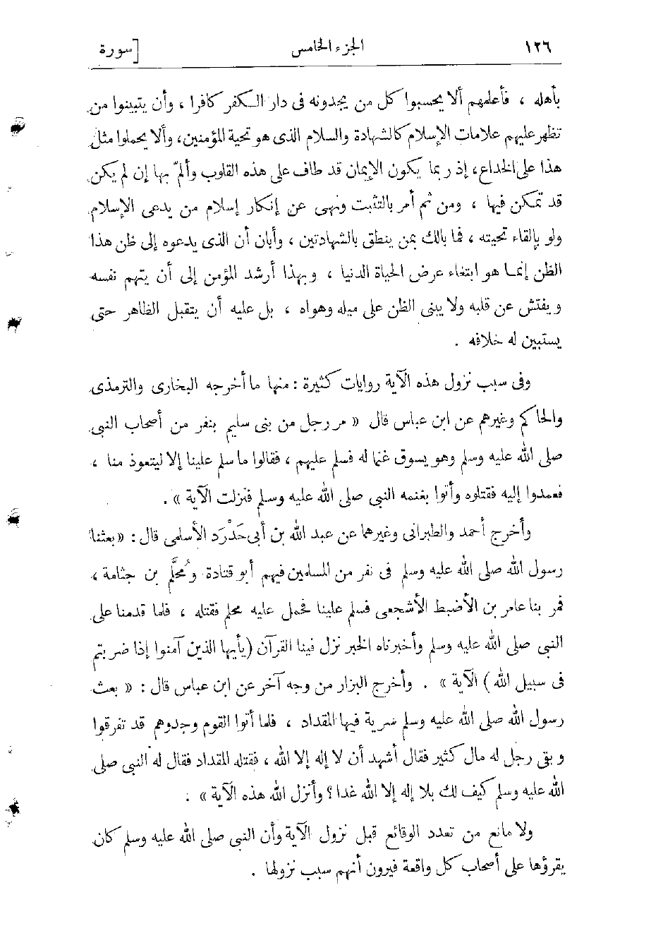 بأهله، فأعلمهم ألا يحسبوا كل من يجدونه فى دار الكفر كافرا، وأن يتبينوا من تظهر عليهم علامات الإسلام كالشهادة والسلام الذي هو تحية المؤمنين، وألا يحملوا مثل هذا على الخداع، إذ ربما يكون الإيمان قد طاف على هذه القلوب وألمّ بها إن لم يكن قد تمكن فيها، ومن ثم أمر بالتثبت ونهى عن إنكار إسلام من يدعى الإسلام ولو بإلقاء تحيته، فما بالك بمن ينطق بالشهادتين، وأبان أن الذي يدعوه إلى ظن هذا الظن إنما هو ابتغاء عرض الحياة الدنيا؟ وبهذا أرشد المؤمن إلى أن يتهم نفسه ويفتش عن قلبه ولا يبنى الظن على ميله وهواه، بل عليه أن يتقبل الظاهر حتى يستبين له خلافه.