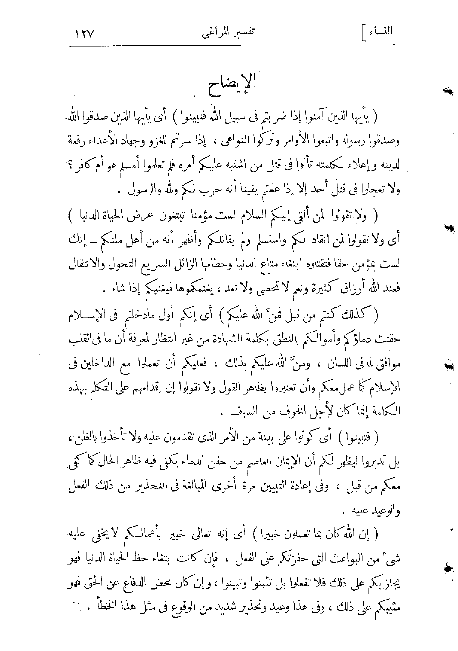 (يا أَيُّهَا الَّذِينَ آمَنُوا إِذا ضَرَبْتُمْ فِي سَبِيلِ اللَّهِ فَتَبَيَّنُوا) أي يا أيها الذين صدقوا الله وصدقوا رسوله واتبعوا الأوامر وتركوا النواهي، إذا سرتم للغزو وجهاد الأعداء رفعة لدينه وإعلاء لكلمته، تأنوا فى قتل من اشتبه عليكم أمره فلم تعلموا أمسلم هو أم كافر؟ ولا تعجلوا فى قتل أحد إلا إذا علمتم يقينا أنه حرب لكم ولله والرسول (وَلا تَقُولُوا لِمَنْ أَلْقى إِلَيْكُمُ السَّلامَ لَسْتَ مُؤْمِناً تَبْتَغُونَ عَرَضَ الْحَياةِ الدُّنْيا) أي ولا تقولوا لمن انقاد لكم واستسلم ولم يقاتلكم وأظهر أنه من أهل ملتكم- إنك لست بمؤمن حقا فتقتلوه ابتغاء متاع الدنيا وحطامها الزائل السريع التحول والانتقال، فعند الله أرزاق كثيرة ونعم لا تحصى ولا تعد، يغنّمكموها فيغنيكم إذا شاء.