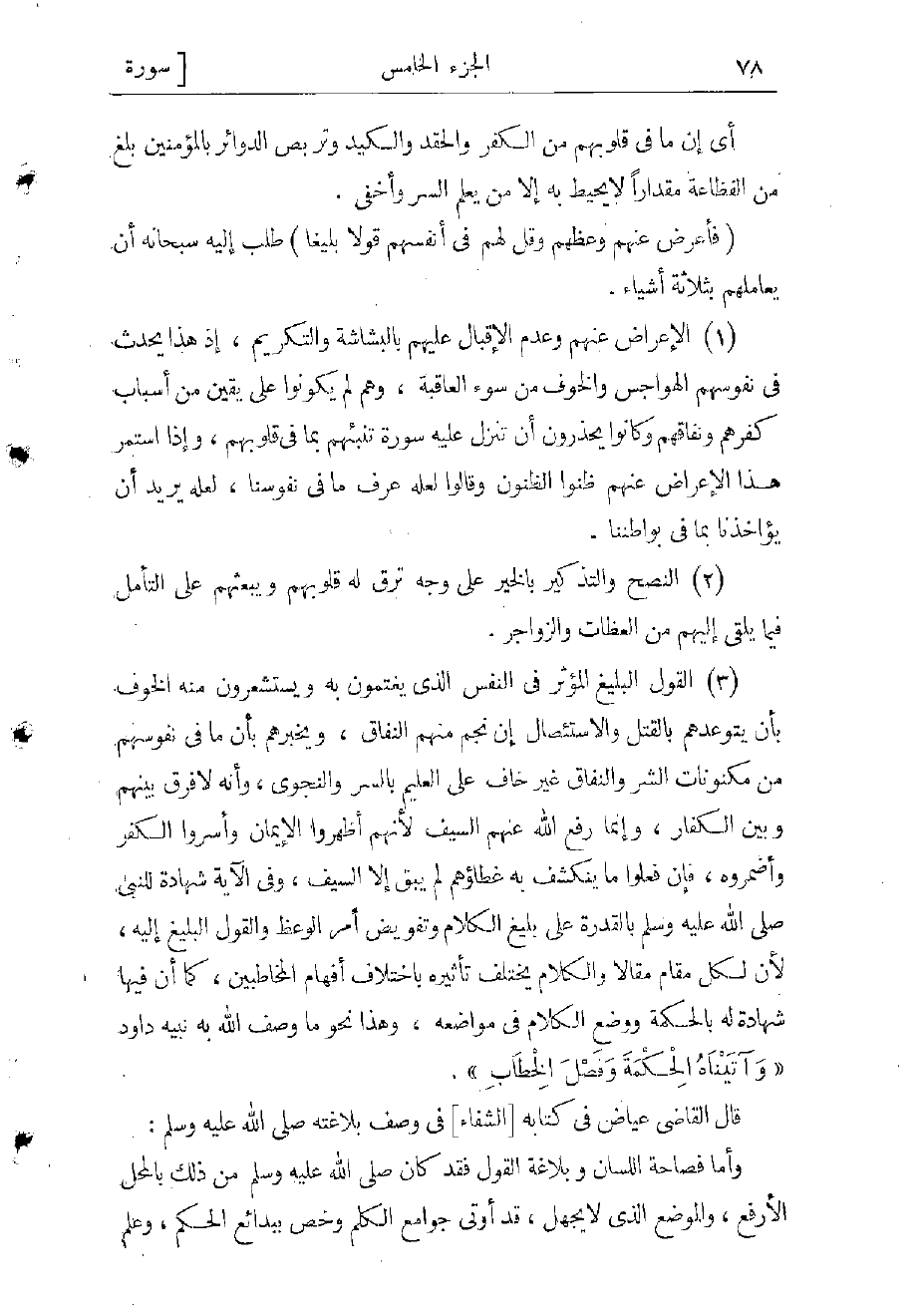 3) القول البليغ المؤثر فى النفس الذي يغتمون به ويستشعرون منه الخوف بأن يتوعدهم بالقتل والاستئصال إن نجم منهم النفاق، ويخبرهم بأن ما فى نفوسهم من مكنونات الشر والنفاق غير خاف على العليم بالسر والنجوى، وأنه لا فرق بينهم وبين الكفار، وإنما رفع الله عنهم السيف لأنهم أظهروا الإيمان وأسرّوا الكفر وأضمروه، فإن فعلوا ما ينكشف به غطاؤهم لم يبق إلا السيف، وفى الآية شهادة للنبى صلى الله عليه وسلم بالقدرة على بليغ الكلام وتفويض أمر الوعظ والقول البليغ إليه، لأن لكل مقام مقالا، والكلام يختلف تأثيره باختلاف أفهام المخاطبين، كما أن فيها شهادة له بالحكمة ووضع الكلام فى مواضعه، وهذا نحو ما وصف الله به نبيه داود «وَآتَيْناهُ الْحِكْمَةَ وَفَصْلَ الْخِطابِ» .