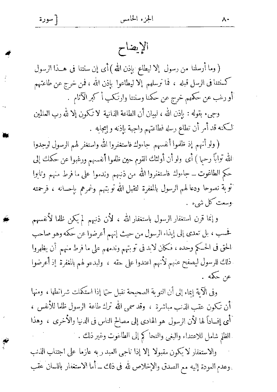 وإنما قرن استغفار الرسول باستغفار الله، لأن ذنبهم لم يكن ظلما لأنفسهم فحسب بل تعدى إلى إيذاء الرسول من حيث إنهم أعرضوا عن حكمه وهو صاحب الحق فى الحكم وحده، فكان لا بد فى توبتهم وندمهم على ما فرط منهم أن يظهروا ذلك للرسول ليصفح عنهم، لأنهم اعتدوا على حقه، وليدعو لهم بالمغفرة، إذ أعرضوا عن حكمه.