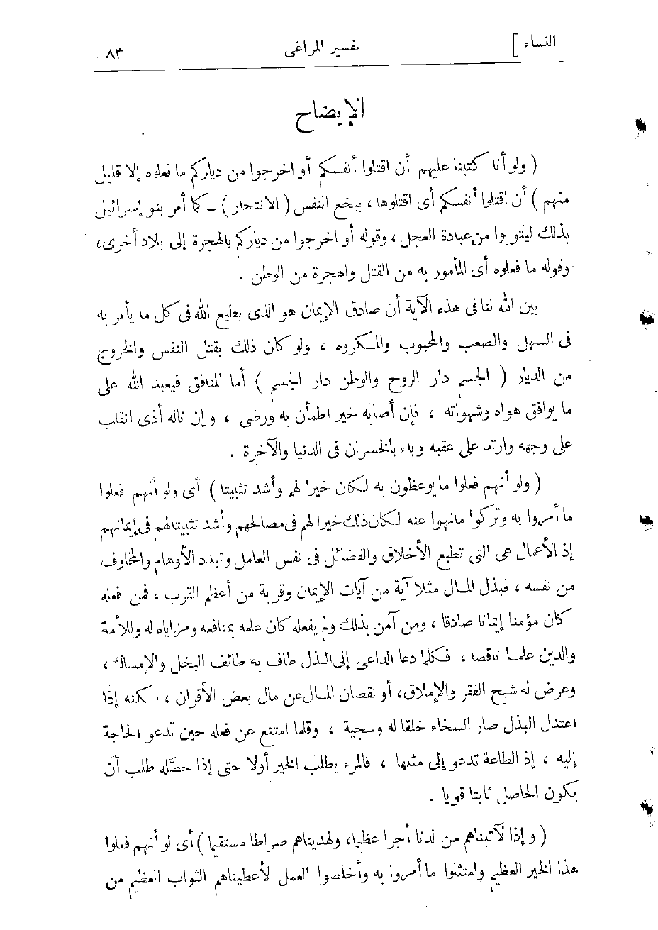 (وَلَوْ أَنَّا كَتَبْنا عَلَيْهِمْ أَنِ اقْتُلُوا أَنْفُسَكُمْ أَوِ اخْرُجُوا مِنْ دِيارِكُمْ ما فَعَلُوهُ إِلَّا قَلِيلٌ مِنْهُمْ) أن اقتلوا أنفسكم: أي اقتلوها ببخع النفس (الانتحار) - كما أمر بنو إسرائيل بذلك ليتوبوا من عبادة العجل، وقوله أو اخرجوا من دياركم بالهجرة إلى بلاد أخرى، وقوله ما فعلوه: أي المأمور به من القتل والهجرة من الوطن.