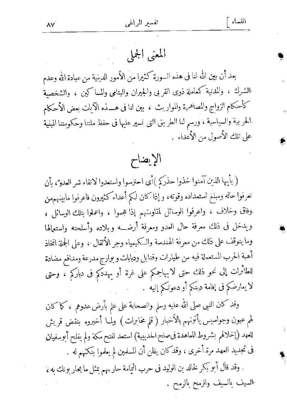 بعد أن بين سبحانه فى هذه السورة كثيرا من الأمور الدينية من عبادته تعالى وعدم الشرك به، والمدنية كمعاملة ذوى القربى والجيران واليتامى والمساكين، والشخصية كأحكام الزواج والمصاهرة والمواريث، بيّن فى هذه الآيات بعض الأحكام الحربية والسياسية، ورسم لنا الطريق التي نسير عليها فى حفظ ملتنا وحكومتنا المبنية على تلك الأصول من الأعداء.