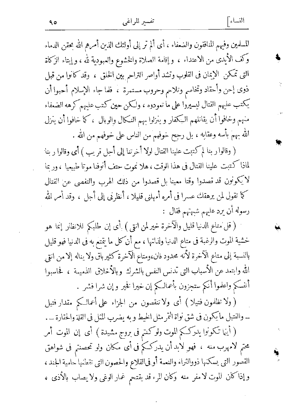 وكف الأيدى من الاعتداء، وإقامة الصلاة والخشوع لله، وإيتاء الزكاة التي تمكّن الإيمان فى القلوب، وتشد أواصر التراحم بين الخلق، وقد كانوا من قبل ذوى إحن وأحقاد وتخاصم وتلاحم وحروب مستمرة، فلما جاء الإسلام أحبوا أن يكتب عليهم القتال ليسيروا على ما تعودوه، ولكن حين كتب عليهم كرهه الضعفاء منهم وخافوا أن يقاتلهم الكفار وينزلوا بهم النكال والوبال، كما خافوا أن ينزل الله بهم بأسه وعقابه بل رجح خوفهم من الناس على خوفهم من الله.