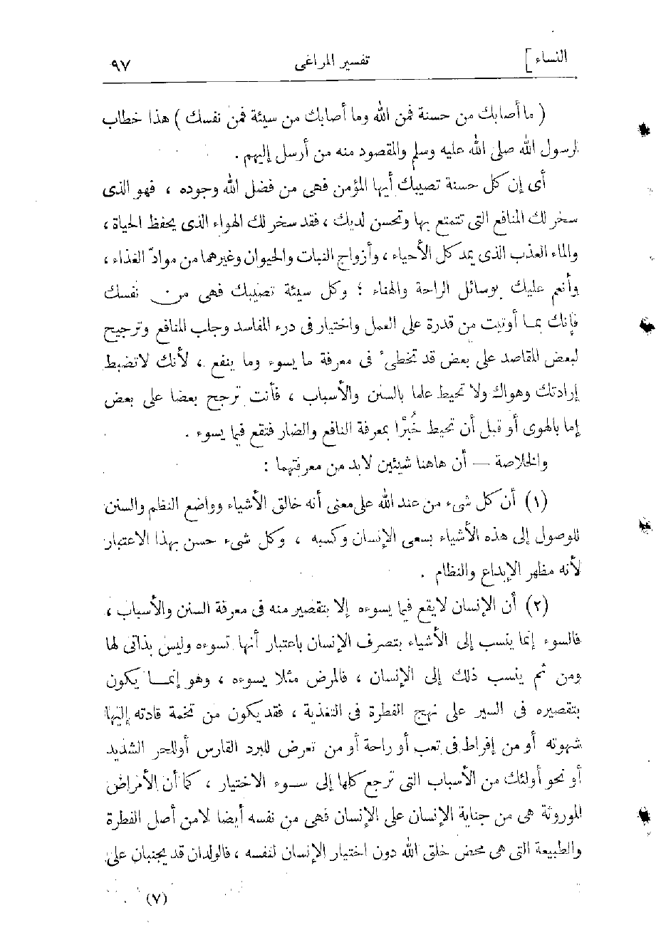 2) إن الإنسان لا يقع فيما يسوءه إلا بتقصير منه فى معرفة السنن والأسباب، فالسوء إنما ينسب إلى الأشياء بتصرف الإنسان باعتبار أنها تسوءه وليس بذاتىّ لها، ومن ثم ينسب ذلك إلى الإنسان، فالمرض مثلا يسوءه، وهو إنما يكون بتقصيره فى السير على نهج الفطرة فى التغذية، فقد يكون من تخمة قادته إليها شهوته أو من إفراط فى تعب أو راحة أو من تعرض للبرد القارس أو للحر الشديد أو نحو أولئك من لأسباب التي ترجع كلها إلى سوء الاختيار، كما أن الأمراض الموروثة هى من جناية الإنسان على الإنسان فهى من نفسه أيضا، لا من أصل الفطرة والطبيعة التي هى محض خلق الله دون اختيار الإنسان لنفسه، فالوالدان قد يجنيان على المرء بتعريض أنفسهما