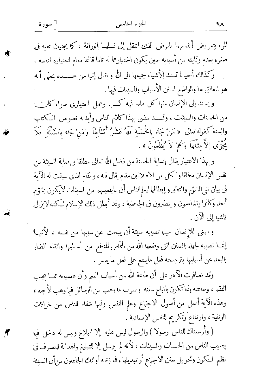 وبهذا الاعتبار يقال إصابة الحسنة من فضل الله تعالى مطلقا، وإصابة السيئة من نفس الإنسان مطلقا، ولكل من الإطلاقين مقام يقال فيه، والمقام الذي سيقت له الآية فى بيان نفى الشؤم والتطير وإبطالهما، ليعلم الناس أن ما يصيبهم من السيئات لا يكون بشؤم أحد، وكانوا يتشاءمون ويتطيرون فى الجاهلية، وقد أبطل ذلك الإسلام لكنه لا يزال فاشيا إلى الآن.