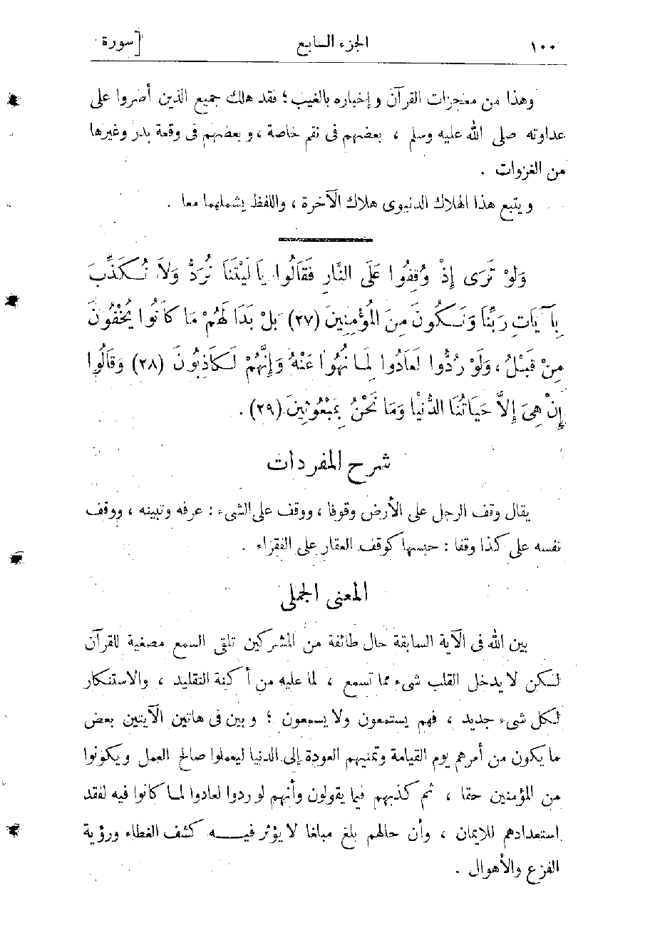 بين الله فى الآية السابقة حال طائفة من المشركين تلقى السمع مصغية للقرآن لكن لا يدخل القلب شىء مما تسمع، لما عليه من أكنة التقليد، والاستنكار لكل شىء جديد، فهم يستمعون ولا يسمعون وبين فى هاتين الآيتين بعض ما يكون من أمرهم يوم القيامة وتمنيهم العودة إلى الدنيا ليعملوا صالح العمل ويكونوا من المؤمنين حقا ثم كذبهم فيما يقولون وأنهم لو ردوا لعادوا لما كانوا فيه لفقد استعدادهم للإيمان، وأن حالهم بلغ مبلغا لا يؤثّر فيه كشف الغطاء ورؤية الفزع والأهوال.