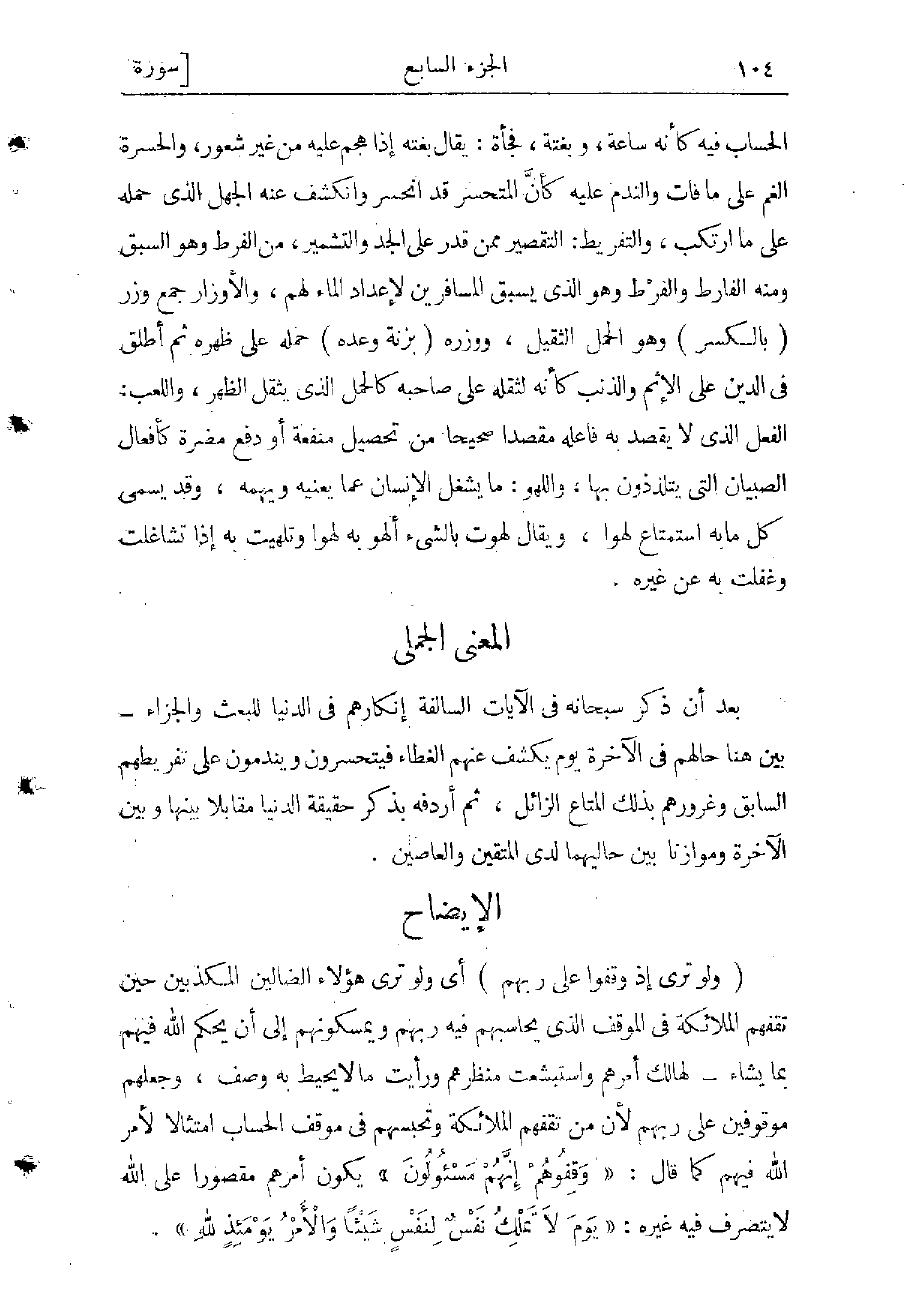 الحساب فيه كأنه ساعة، وبغتة: فجأة، يقال بغته إذا هجم عليه من غير شعور، والحسرة الغم على ما فات والندم عليه كأنّ المتحسر قد انحسر وانكشف عنه الجهل الذي حمله على ما ارتكب، والتفريط: التقصير ممن قدر على الجد والتشمير، من الفرط وهو السبق ومنه الفارط والفرط وهو الذي يسبق المسافرين لإعداد الماء لهم، والأوزار جمع وزر (بالكسر) وهو الحمل الثقيل، ووزره (بزنة وعده) حمله على ظهره ثم أطلق فى الدين على الإثم والذنب كأنه لثقله على صاحبه كالحمل الذي يثقل الظهر، واللعب: