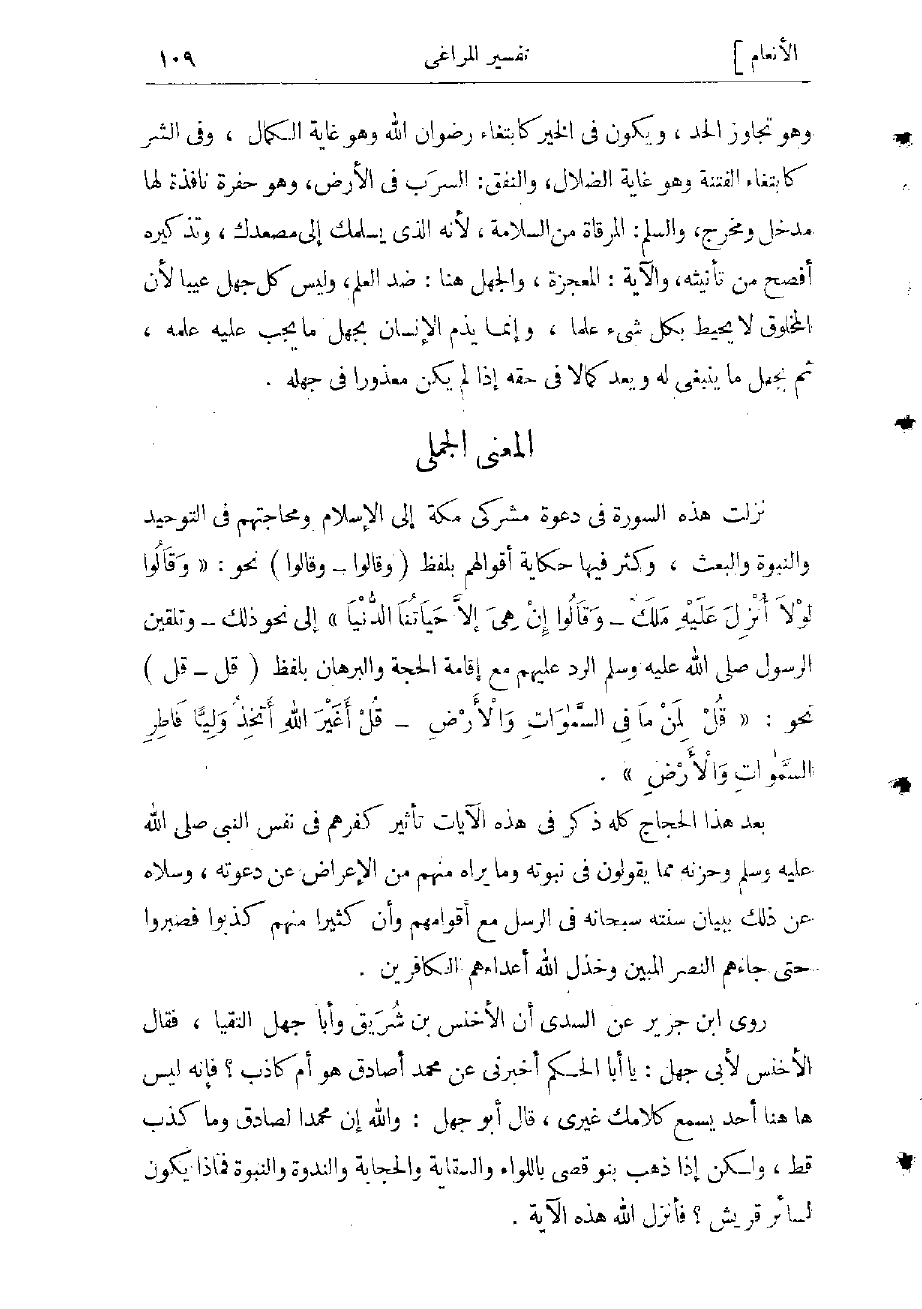 ويكون فى الخير كابتغاء رضوان الله وهو غاية الكمال، وفى الشر كابتغاء الفتنة وهو غاية الضلال، والنفق: السرب فى الأرض، وهو حفرة نافذة لها مدخل ومخرج، والسلم: المرقاة من السلامة، لأنه الذي يسلمك إلى مصعدك، وتذكيره أفصح من تأنيثه، والآية: المعجزة، والجهل هنا: ضد العلم، وليس كل جهل عيبا، لأن المخلوق لا يحيط بكل شىء علما، وإنما يذم الإنسان بجهل ما يجب عليه علمه، ثم بجهل ما ينبغى له ويعدّ كمالا فى حقه إذا لم يكن معذورا فى جهله.