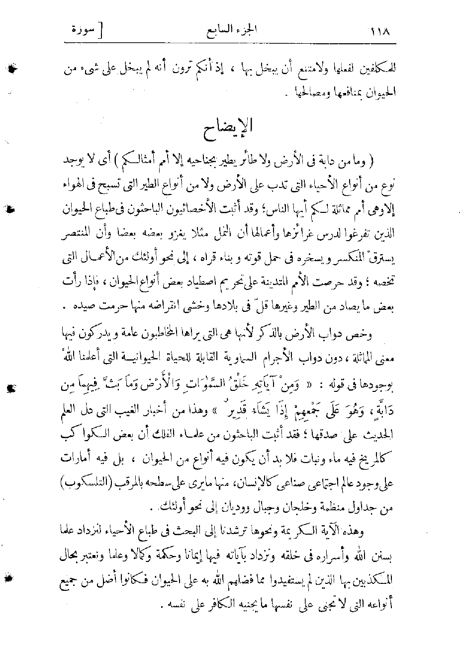 وخص دواب الأرض بالذكر لأنها هى التي يراها المخاطبون عامة ويدركون فيها معنى المماثلة، دون دواب الأجرام السماوية القابلة للحياة الحيوانية التي أعلمنا الله بوجودها فى قوله: «وَمِنْ آياتِهِ خَلْقُ السَّماواتِ وَالْأَرْضِ وَما بَثَّ فِيهِما مِنْ دابَّةٍ، وَهُوَ عَلى جَمْعِهِمْ إِذا يَشاءُ قَدِيرٌ» وهذا من أخبار الغيب التي دل العلم الحديث على صدقها فقد أثبت الباحثون من علماء الفلك أن بعض الكواكب كالمرّيخ فيه ماء ونبات فلا بد أن يكون فيه أنواع من الحيوان، بل فيه أمارات على وجود عالم اجتماعي صناعى كالإنسان.