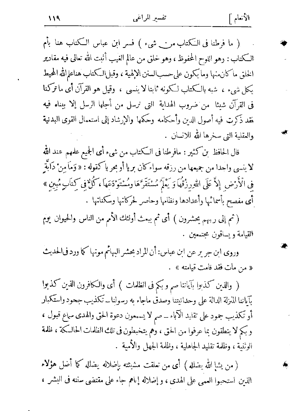 قال الحافظ ابن كثير ما فرطنا فى الكتاب من شىء أي الجميع علمهم عند الله لا ينسى واحدا من جميعها من رزقه سواء كان بريا أو بحريا كقوله: «وَما مِنْ دَابَّةٍ فِي الْأَرْضِ إِلَّا عَلَى اللَّهِ رِزْقُها وَيَعْلَمُ مُسْتَقَرَّها وَمُسْتَوْدَعَها، كُلٌّ فِي كِتابٍ مُبِينٍ» أي مفصح بأسمائها وأعدادها ونظامها وحاصر لحركاتها وسكناتها.