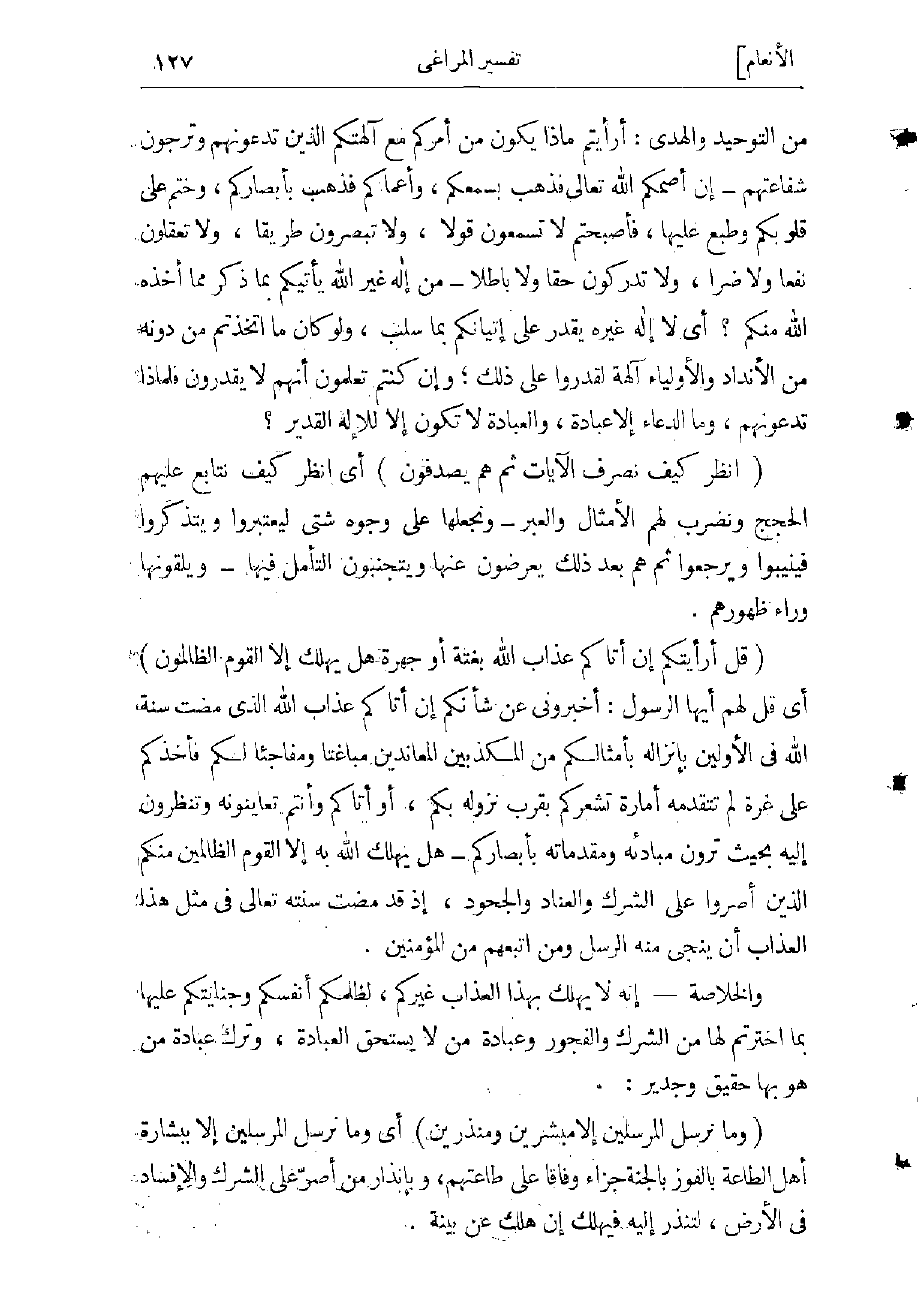 (قُلْ أَرَأَيْتَكُمْ إِنْ أَتاكُمْ عَذابُ اللَّهِ بَغْتَةً أَوْ جَهْرَةً هَلْ يُهْلَكُ إِلَّا الْقَوْمُ الظَّالِمُونَ) أي قل لهم أيها الرسول: أخبرونى عن شأنكم إن أتاكم عذاب الله الذي مضت سنة الله فى الأولين بإنزاله بأمثالكم من المكذبين المعاندين مباغتا ومفاجئا لكم فأخذكم على غرّة لم تتقدمه أمارات تشعركم بقرب نروله بكم، أو أتاكم وأنتم تعاينونه وتنظرون إليه بحيث ترون مبادئه ومقدماته بأبصاركم- هل يهلك الله به إلا القوم الظالمين منكم الذين أصروا على الشرك والعناد والجحود، إذ قد مضت سنته تعالى فى مثل هذا العذاب أن ينجى منه الرسل ومن اتبعهم من المؤمنين والخلاصة- إنه لا يهلك بهذا العذاب غيركم، لظلمكم أنفسكم وجنايتكم عليها بما اخترتم لها من الشرك والفجور وعبادة من لا يستحق العبادة، وترك عبادة من هو بها حقيق وجدير.