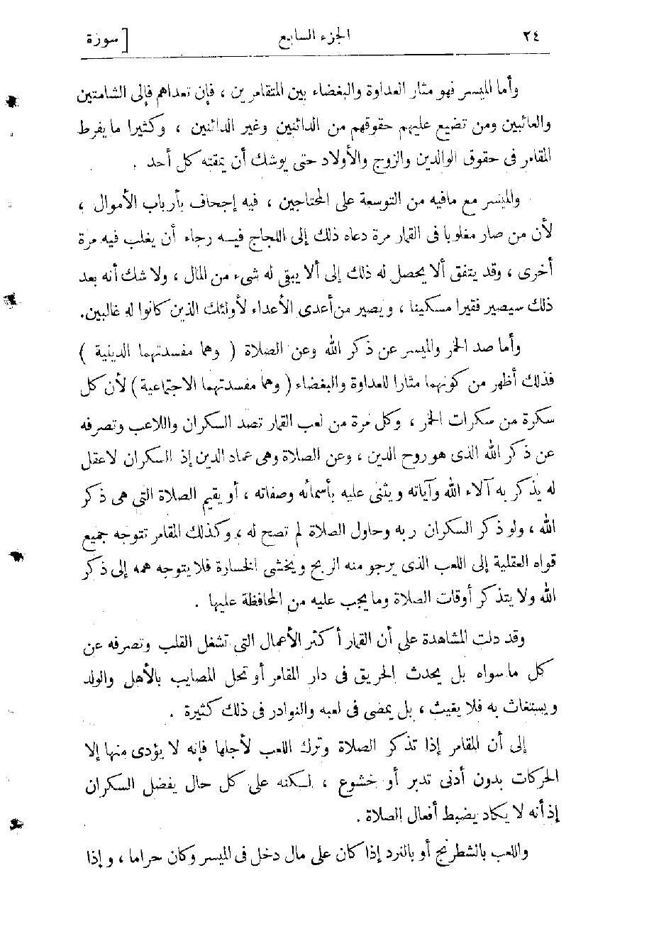 وأما صد الخمر والميسر عن ذكر الله وعن الصلاة (وهما مفسدتهما الدينية) فذلك أظهر من كونهما مثارا للعداوة والبغضاء (وهما مفسدتهما الاجتماعية) لأن كل سكرة من سكرات الخمر، وكل مرة من لعب القمار تصد السكران واللاعب وتصرفه عن ذكر الله الذي هو روح الدين، وعن الصلاة وهى عماد الدين، إذ السكران لا عقل له يذكر به آلاء الله وآياته، ويثنى عليه بأسمائه وصفاته، أو يقيم الصلاة التي هى ذكر الله، ولو ذكر السكران ربه وحاول الصلاة لم تصح له، وكذلك المقامر تتوجه جميع قواه العقلية إلى اللعب الذي يرجو منه الربح ويخشى الخسارة، فلا يتوجه همه إلى ذكر الله ولا يتذكر أوقات الصلاة وما يجب عليه من المحافظة عليها.