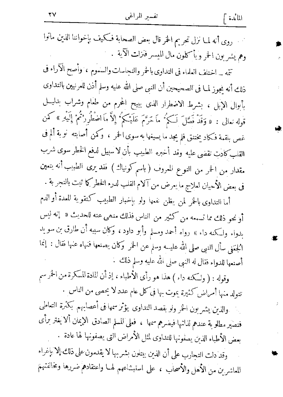 تتمة- اختلف العلماء فى التداوى بالخمر والنجاسات والسموم، وأصح الآراء فى ذلك أنه يجوز لما فى الصحيحين أن النبي صلى الله عليه وسلم أذن للعرنّيين بالتداوى بأبوال الإبل، بشرط الاضطرار الذي يبيح المحرم من طعام وشراب بدليل قوله تعالى «وَقَدْ فَصَّلَ لَكُمْ ما حَرَّمَ عَلَيْكُمْ إِلَّا مَا اضْطُرِرْتُمْ إِلَيْهِ» كمن غصّ بلقمة فكاد يختنق فلم يجد ما يسيغها به سوى الخمر، وكمن أصابته نوبة ألم فى القلب كادت تقضى عليه وقد أخبره الطبيب بأن لا سبيل لدفع الخطر سوى شرب مقدار من الخمر من النوع المعروف (باسم كونياك) فقد يرى الطبيب أنه يتعين فى بعض الأحيان لعلاج ما يعرض من آلام القلب لدرء الخطر كما ثبت بالتجربة.