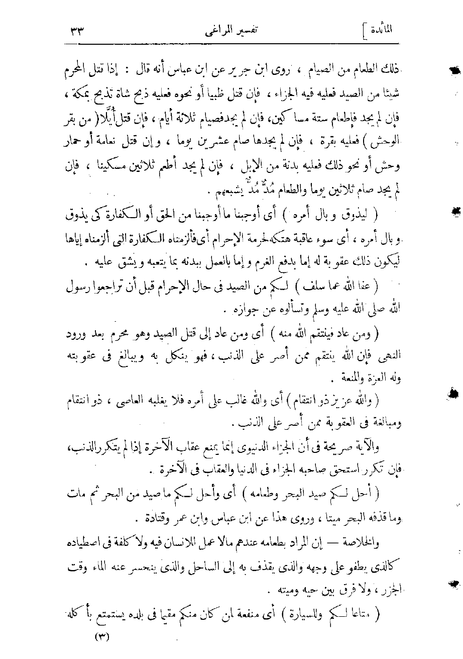 ذلك الطعام من الصيام، روى ابن جرير عن ابن عباس أنه قال: إذا قتل المحرم شيئا من الصيد فعليه فيه الجزاء، فإن قتل ظبيا أو نحوه فعليه ذبح شاة تذبح بمكة، فإن لم يجد فإطعام ستة مساكين، فإن لم يجد فصيام ثلاثة أيام، فإن قتل أيّلا (من بقر الوحش) فعليه بقرة، فإن لم يجدها صام عشرين يوما، وإن قتل نعامة أو حمار وحش أو نحو ذلك فعليه بدنة من الإبل، فإن لم يجد أطعم ثلاثين مسكينا فإن لم يجد صام ثلاثين يوما والطعام مدّ مدّ يشبعهم.