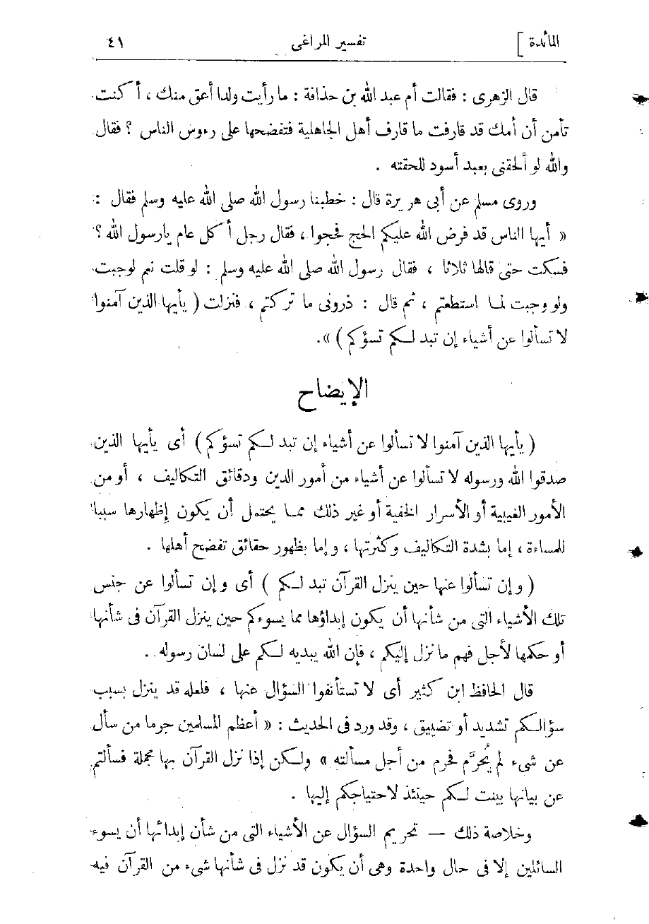 وروى مسلم عن أبي هريرة قال: خطبنا رسول الله صلى الله عليه وسلم فقال: «أيها الناس قد فرض الله عليكم الحج فحجوا، فقال رجل أكلّ عام يا رسول الله؟ فسكت حتى قالها ثلاثا، فقال رسول الله صلى الله عليه وسلم. لو قلت نعم لوجبت ولو وجبت لما استطعتم ثم قال: ذرونى ما تركتكم، فنزلت (يا أَيُّهَا الَّذِينَ آمَنُوا لا تَسْئَلُوا عَنْ أَشْياءَ إِنْ تُبْدَ لَكُمْ تَسُؤْكُمْ) »