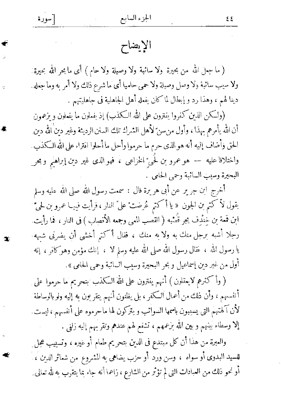 والعبرة من هذا أن كل مبتدع فى الدين بتحريم طعام أو غيره، وتسييب عجل لسيد البدوي أو سواه، وسنّ ورد أو حزب يضاهى به المشروع من شعائر الدين، ونحو ذلك من العبادات التي لم تؤثر عن الشارع، زاعما أنه جاء بما يتقرب به لله تعالى
