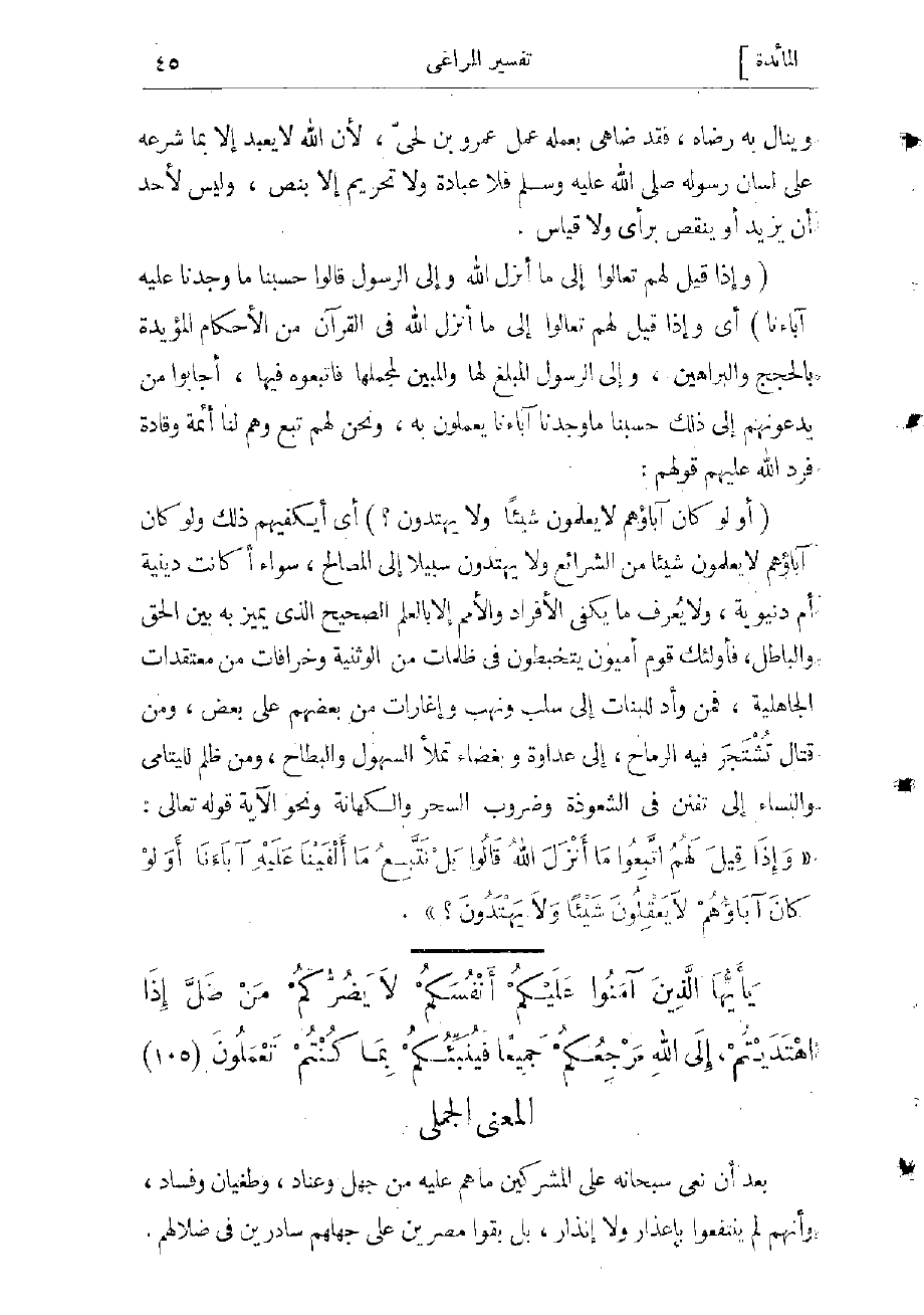 (وَإِذا قِيلَ لَهُمْ تَعالَوْا إِلى ما أَنْزَلَ اللَّهُ وَإِلَى الرَّسُولِ قالُوا حَسْبُنا ما وَجَدْنا عَلَيْهِ آباءَنا) أي وإذا قيل لهم تعالوا إلى ما أنزل الله فى القرآن من الأحكام المؤيدة بالحجج والبراهين، وإلى الرسول المبلغ لها والمبين لمجملها فاتبعوه فيها، أجابوا من يدعونهم إلى ذلك حسبنا ما وجدنا آباءنا يعملون به، ونحن لهم تبع وهم لنا أئمة وقادة. فرد الله عليهم قولهم: