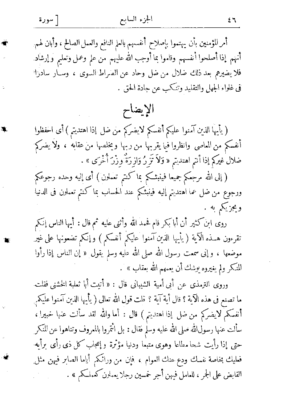 وروى الترمذي عن أبي أمية الشيباني قال: «أتيت أبا ثعلبة الخشني فقلت ما تصنع فى هذه الآية؟ قال أيّة آية؟ قلت قول الله تعالى (يا أَيُّهَا الَّذِينَ آمَنُوا عَلَيْكُمْ أَنْفُسَكُمْ لا يَضُرُّكُمْ مَنْ ضَلَّ إِذَا اهْتَدَيْتُمْ) قال أما والله لقد سألت عنها خبيرا، سألت عنها رسول الله صلى الله عليه وسلم فقال: بل ائتمروا بالمعروف وتناهوا عن المنكر حتى إذا رأيت شحّا مطاعا، وهوى متّبعا، ودنيا مؤثرة، وإعجاب كل ذى رأى برأيه فعليك بخاصة نفسك ودع عنك العوامّ، فإن من ورائكم أياما الصابر فيهن مثل القابض على الجمر، للعامل فيهن أجر خمسين رجلا يعملون كعملكم» .