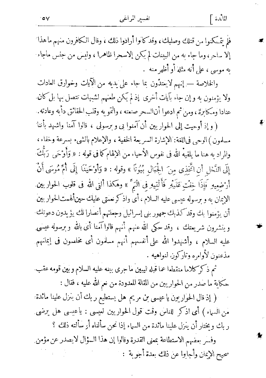 (وَإِذْ أَوْحَيْتُ إِلَى الْحَوارِيِّينَ أَنْ آمِنُوا بِي وَبِرَسُولِي، قالُوا آمَنَّا وَاشْهَدْ بِأَنَّنا مُسْلِمُونَ) الوحى فى اللغة: الإشارة السريعة الخفية، والإعلام بالشيء بسرعة وخفاء، والمراد به هنا ما يلقيه الله فى نفوس الأحياء من الإلهام كما فى قوله: «وَأَوْحى رَبُّكَ إِلَى النَّحْلِ أَنِ اتَّخِذِي مِنَ الْجِبالِ بُيُوتاً» وقوله «وَأَوْحَيْنا إِلى أُمِّ مُوسى أَنْ أَرْضِعِيهِ فَإِذا خِفْتِ عَلَيْهِ فَأَلْقِيهِ فِي الْيَمِّ» وهكذا ألقى الله فى قلوب الحواريين الإيمان به وبرسوله عيسى عليه السلام، أي واذكر نعمتى عليك حين ألهمت الحواريين أن يؤمنوا بك وقد كذبك جمهور بنى إسرائيل وجعلتهم أنصارا لك يؤيدون دعوتك وينشرون شريعتك، وقد حكى الله عنهم أنهم قالوا آمنا أي با لله وبرسوله عيسى عليه السلام وأشهدوا الله على أنفسهم أنهم مسلمون أي مخلصون فى إيمانهم مذعنون لأوامره وتاركون لنواهيه.