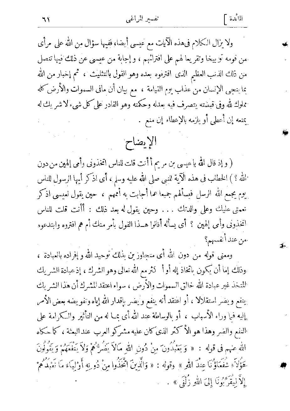 ولا يزال الكلام فى هذه الآيات مع عيسى أيضا، ففيها سؤال من الله على مرأى من قومه توبيخا وتقريعا لهم على افترائهم، وإجابة من عيسى عن ذلك فيها تنصل من ذلك الذنب العظيم الذي اقترفوه بعده وهو القول بالتثليث، ثم إخبار من الله بما ينجّى الإنسان من عذاب يوم القيامة، مع بيان أن ما فى السموات والأرض كله مملوك له وفى قبضته يتصرف فيه بعدله وحكمته وهو القادر على كل شىء لا شريك له يمنعه إن أعطى، أو يلزمه بالإعطاء إن منع.