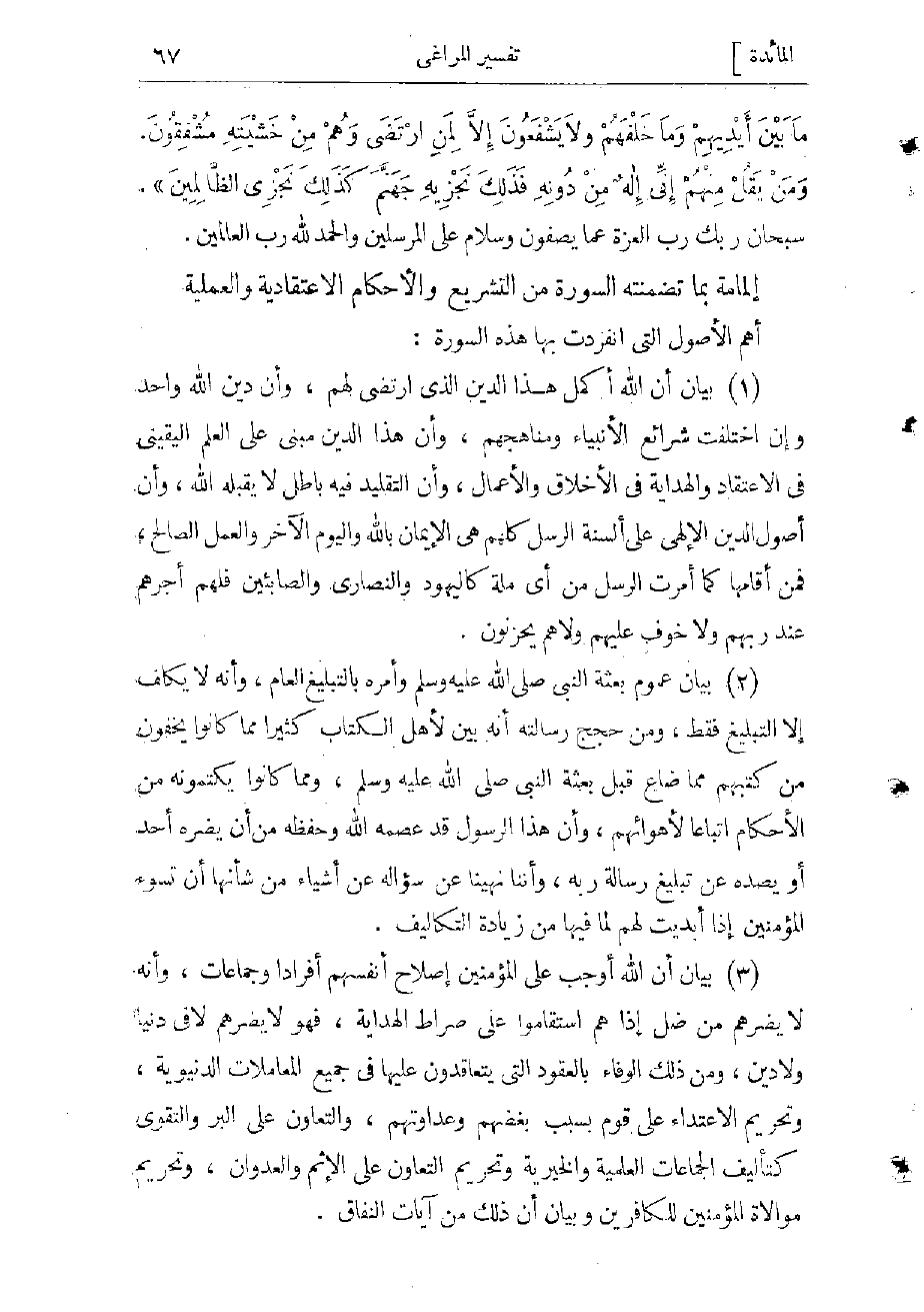 (1) بيان أن الله أكمل هذا الدين الذي ارتضى لهم، وأن دين الله واحد وإن اختلفت شرائع الأنبياء ومناهجهم، وأن هذا الدين مبنى على العلم اليقيني فى الاعتقاد والهداية فى الأخلاق والأعمال، وأن التقليد فيه باطل لا يقبله الله، وأن أصول الدين الإلهى على ألسنة الرسل كلهم هى الإيمان با لله واليوم الآخر والعمل الصالح، فمن أقامها كما أمرت الرسل من أي ملة كاليهود والنصارى والصابئين فلهم أجرهم عند ربهم ولا خوف عليهم ولا هم يحزنون.