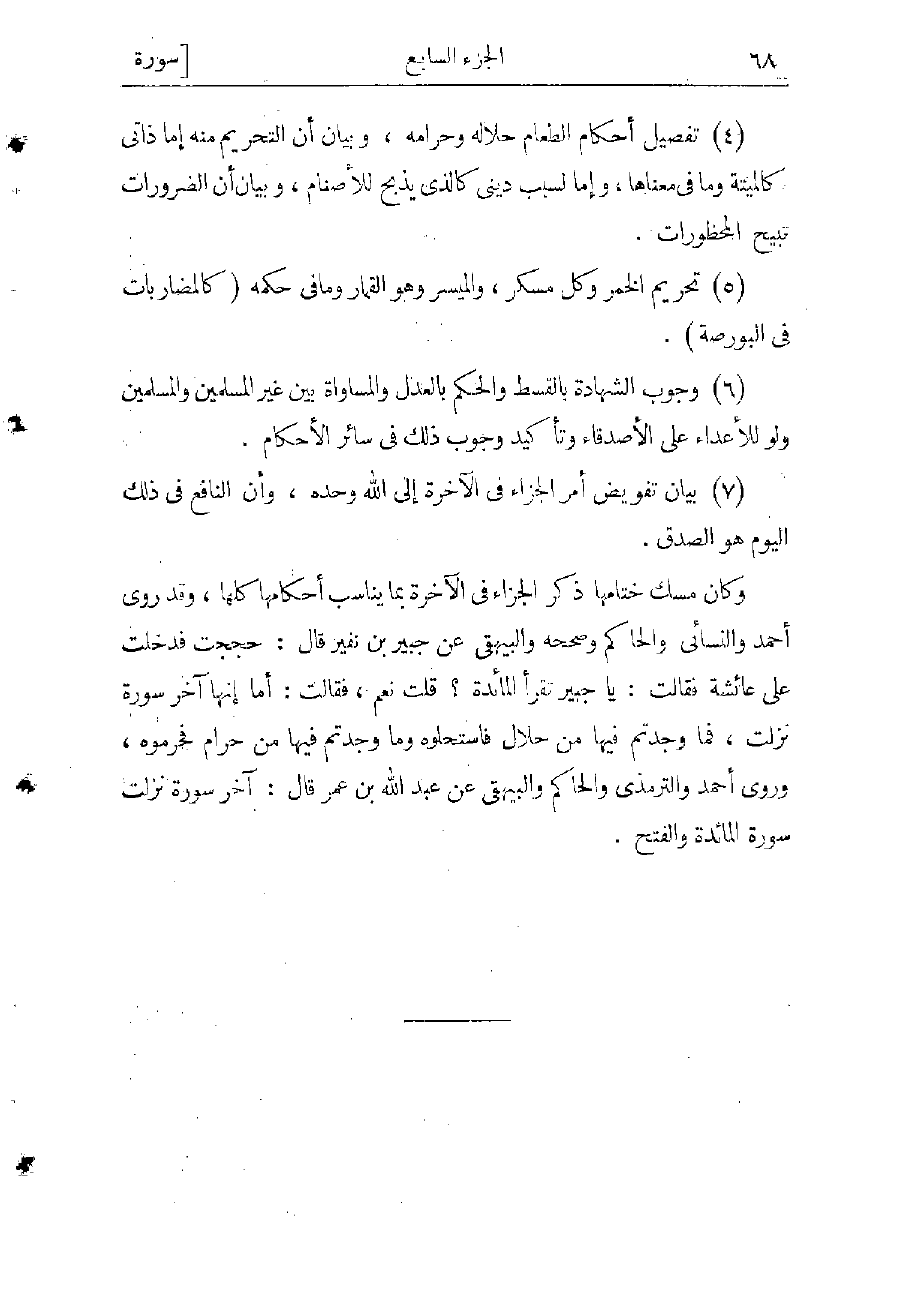 وكان مسك ختامها ذكر الجزاء فى الآخرة بما يناسب أحكامها كلها، وقد روى أحمد والنسائي والحاكم وصححه، والبيهقي عن جبير بن نفير قال: حججت فدخلت على عائشة فقالت يا جبير تقرأ المائدة؟ قلت نعم، فقالت: أما إنها آخر سورة نزلت، فما وجدتم فيها من حلال فاستحلّوه، وما وجدتم فيها من حرام فحرّموه. وروى أحمد والترمذي والحاكم والبيهقي عن عبد الله بن عمر قال: آخر سورة نزلت سورة المائدة والفتح.