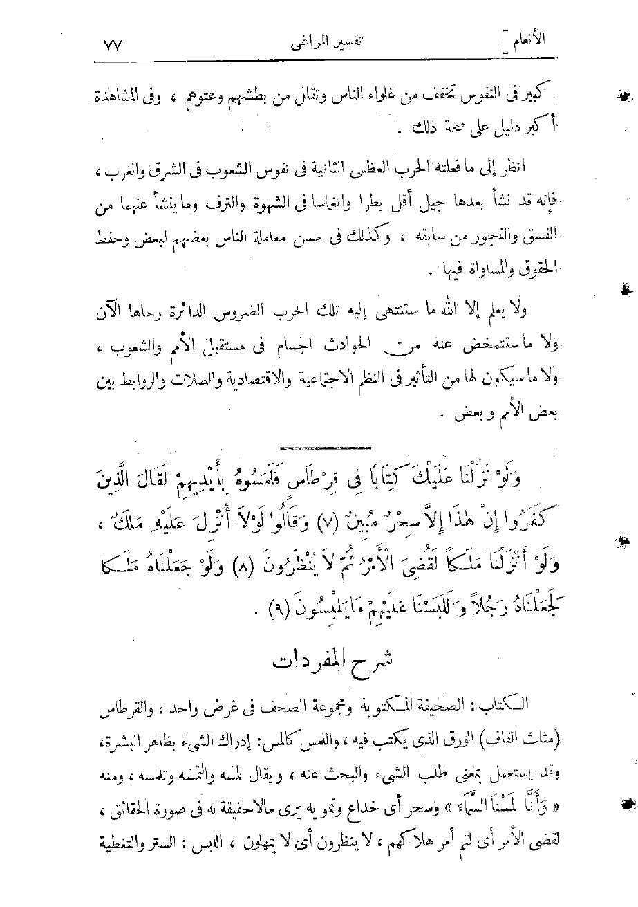 الكتاب: الصحيفة المكتوبة ومجموعه الصحف فى غرض واحد، والقرطاس (مثلث القاف) الورق الذي يكتب فيه، واللمس كالمس: إدراك الشيء بظاهر البشر وقد يستعمل بمعنى طلب الشيء والبحث عنه، ويقال لمسه والتمسه وتلمسه، ومنه «أَنَّا لَمَسْنَا السَّماءَ» وسحر: أي خداع وتمويه يرى ما لا حقيقة له فى صورة الحقائق، لقضى الأمر أي لتم أمر هلاكهم، لا ينظرون أي لا يمهلون، اللبس: الستر والتغطية