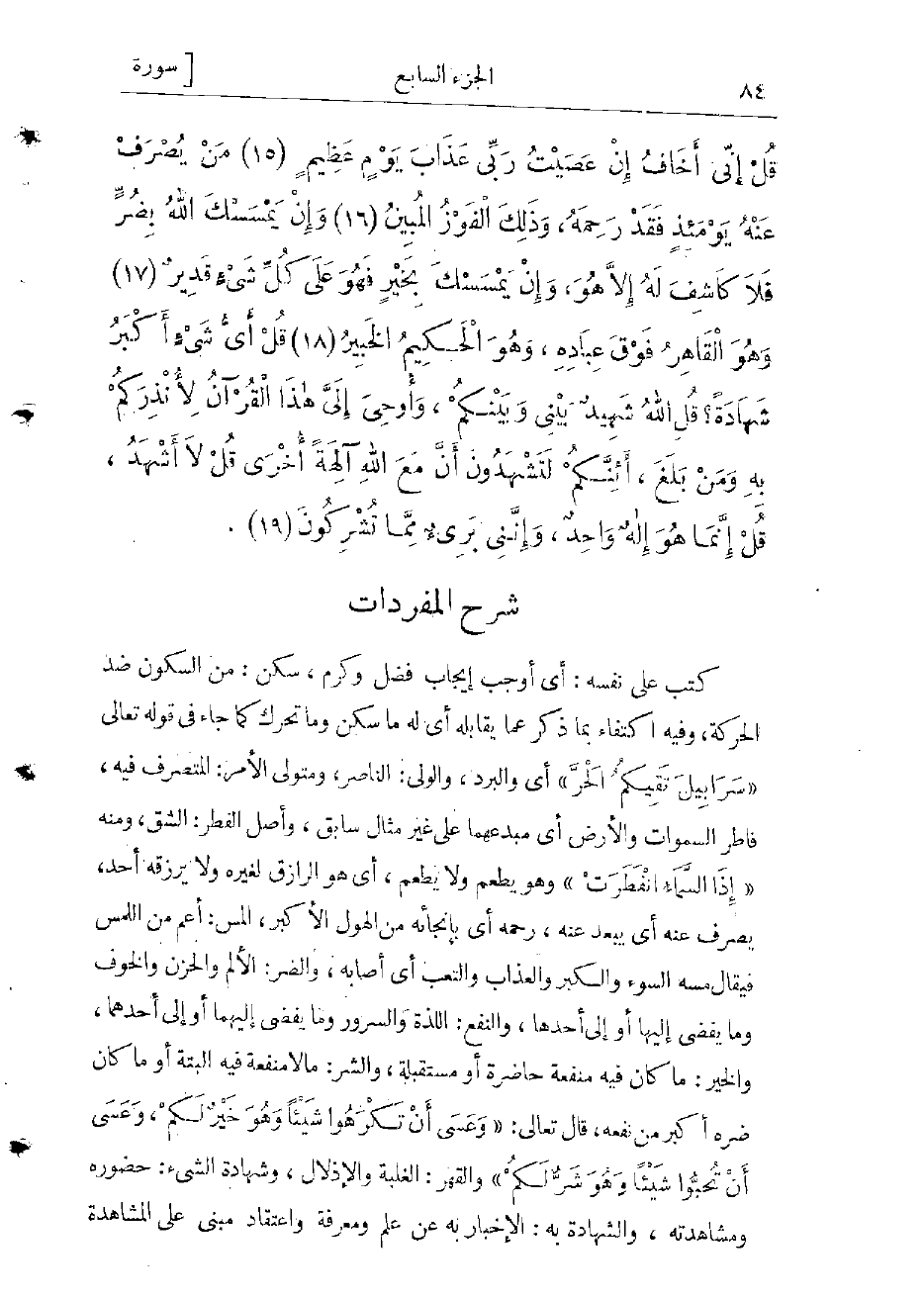 كتب على نفسه: أي أوجب إيجاب فضل وكرم، سكن: من السكون ضد الحركة، وفيه اكتفاء بما ذكر عما يقابله أي له ما سكن وما تحرك كما جاء فى قوله تعالى «سَرابِيلَ تَقِيكُمُ الْحَرَّ» أي والبرد، والولي: الناصر، ومتولى الأمر: المتصرف فيه، فاطر السموات والأرض أي مبدعهما على غير مثال سابق، وأصل الفطر: الشّق ومنه «إِذَا السَّماءُ انْفَطَرَتْ» وهو يطعم ولا يطعم، أي هو الرازق لغيره ولا يرزقه أحد، يصرف عنه أي يبعد عنه، رحمة أي بإنجائه من الهول الأكبر، المس: أعم من اللمس فيقال مسه السوء والكبر والعذاب والتعب أي أصابه، والضر: الألم والحزن والخوف وما يفضى إليها أو إلى أحدها، والنفع اللذة والسرور وما يفضى إليهما أو إلى أحدهما، والخير: ما كان فيه منفعة حاضرة أو مستقبلة، والشر: ما لا منفعة فيه البتة أو ما كان ضره أكبر من نفعه، قال تعالى «وَعَسى أَنْ تَكْرَهُوا شَيْئاً وَهُوَ خَيْرٌ لَكُمْ، وَعَسى أَنْ تُحِبُّوا شَيْئاً وَهُوَ شَرٌّ لَكُمْ» والقهر: الغلبة والإذلال، وشهادة الشيء: حضوره ومشاهدته، والشهادة به: الإخبار به عن علم ومعرفة واعتقاد مبنى على المشاهدة بالبصر أو بالعقل والوجدان، والإنذار: التخويف، واكتفى به عن ذكر البشارة