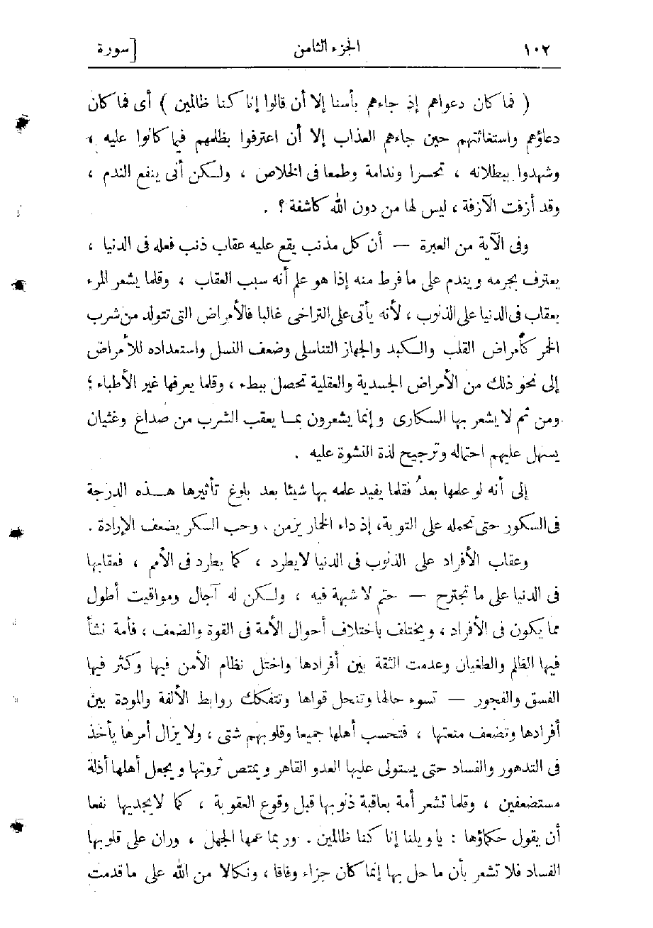 وعقاب الأفراد على الذنوب فى الدنيا لا يطرد، كما يطرد فى الأمم، فعقابها فى الدنيا على ما تجترح- حتم لا شبهة فيه، ولكن له آجال ومواقيت أطول مما يكون فى الأفراد، ويختلف باختلاف أحوال الأمة فى القوة والضعف، فأمة نشأ فيها الظلم والطغيان وعدمت الثقة بين أفرادها واختل نظام الأمن فيها وكثر فيها الفسق والفجور- تسوء حالها وتنحلّ قواها وتتفكك روابط الألفة والمودة بين أفرادها وتضعف منعتها، فتحسب أهلها جميعا وقلوبهم شتى، ولا يزال أمرها يأخذ فى التدهور والفساد حتى يستولى عليها العدو القاهر ويمتص ثروتها ويجعل أهلها أذلة مستضعفين، وقلما تشعر أمة بعاقبة ذنوبها قبل وقوع العقوبة، كما لا يجديها نفعا أن يقول حكماؤها: