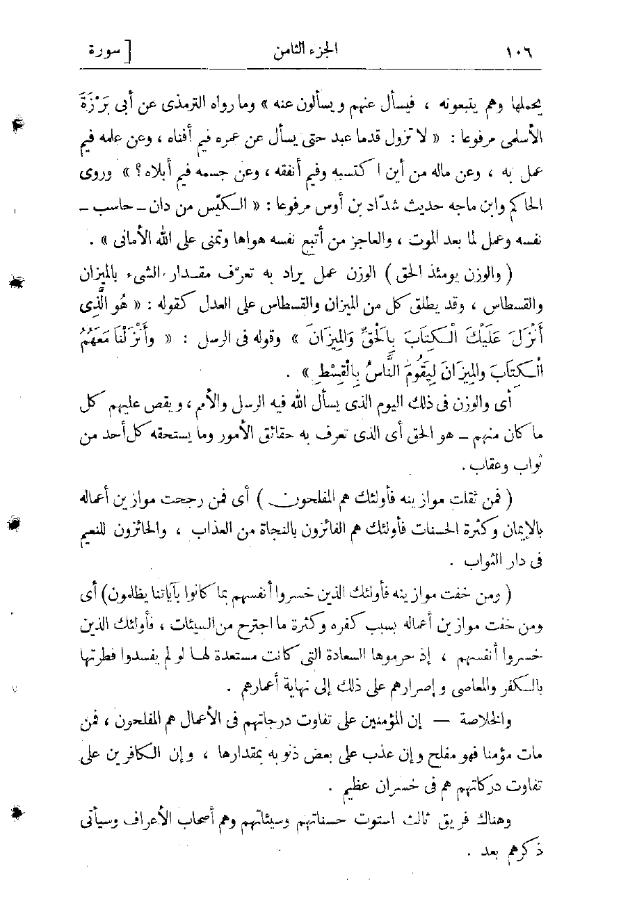(وَالْوَزْنُ يَوْمَئِذٍ الْحَقُّ) الوزن عمل يراد به تعرف مقدار الشيء بالميزان والقسطاس وقد يطلق كل من الميزان والقسطاس على العدل كقوله: «اللَّهُ الَّذِي أَنْزَلَ الْكِتابَ بِالْحَقِّ وَالْمِيزانَ» وقوله فى الرسل: «وَأَنْزَلْنا مَعَهُمُ الْكِتابَ وَالْمِيزانَ لِيَقُومَ النَّاسُ بِالْقِسْطِ» .